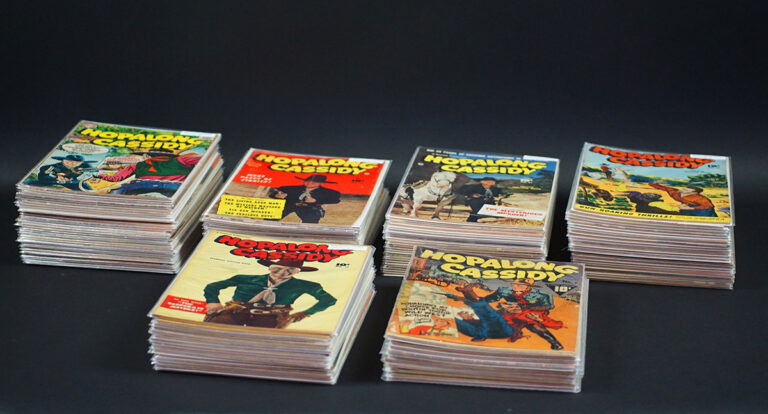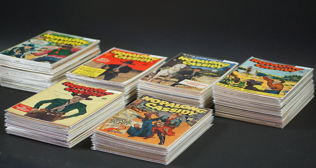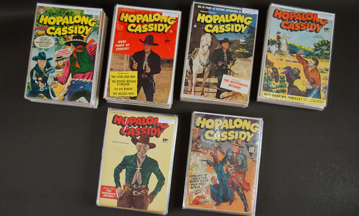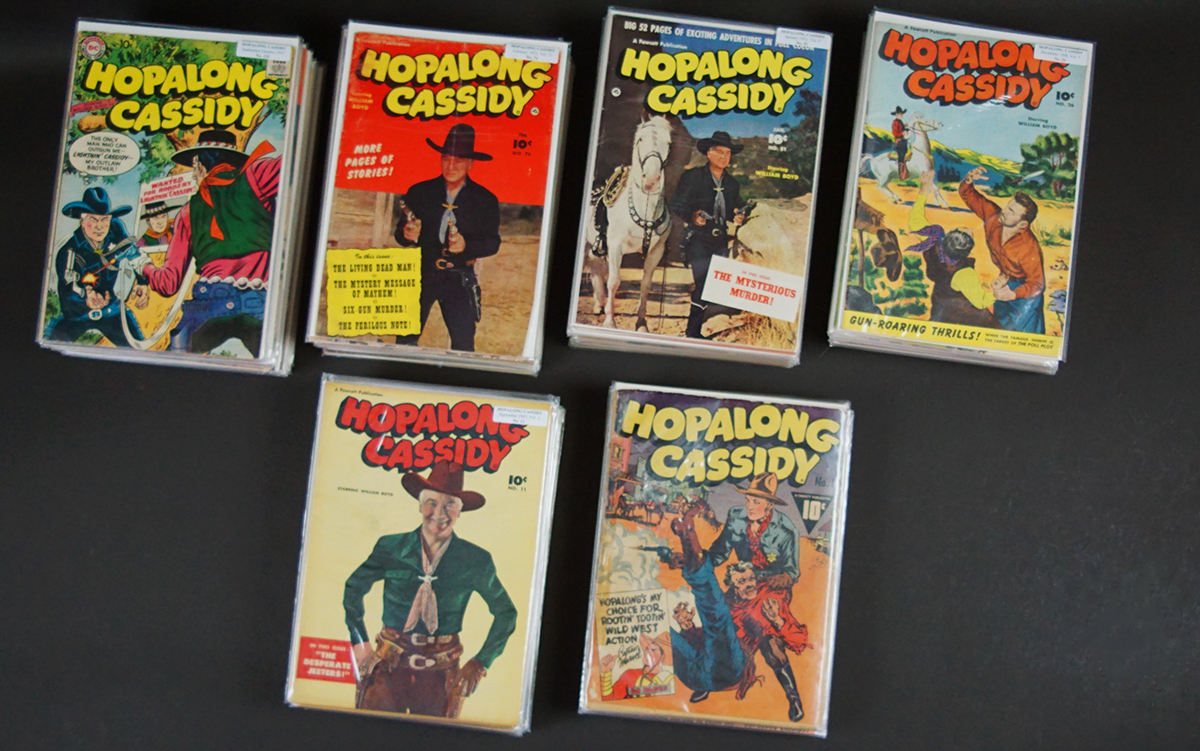 BUY / RESERVE THIS ITEMDescription: A complete, lifetime collection of all the Hopalong Cassidy Comics that date from its first, #1 in 1943 through its final #135 in 1959. The timeline of the comics in this collection is: #1-38 1943-49, #39-50 1950, #51-62 1951, #63-74 1952, #75-85 1953 & the start of DC Comics with #85-96 1954. Overall ratings on these 135 comics are ‘very good’ to ‘very fine’. Only the #1 rates ‘fair’ to ‘good’. Further grading details & individual photos on request.