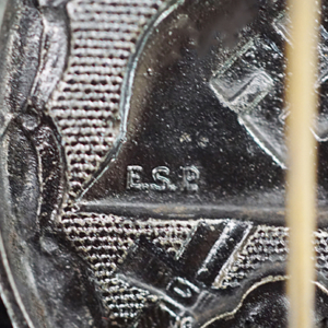 BUY / RESERVE THIS ITEMDescription:. This is a nice & scarce example of a Black Wound Badge by E.S.P. (Eugen Schmidthausser, Pforzheim), a desirable maker. Nearly all of the original slightly glossy black paint is retained on both the front and reverse. It has a nice, crisp “E.S.P.” maker mark on the reverse, indicating manufacture by ‘Eugen Schmidthausser, Pforzheim’. The badge is not magnetic, being stamped alloy. The badges by this maker are heavier and somewhat thicker than most others being 5mm thick. The hardware features a Tombak hinge & pin assembly and steel hook clasp, uniquely crimped into place (see pics). These E.S.P. maker marked Badges are uncommon and scarce. 44 x 37mm & 20 grams.