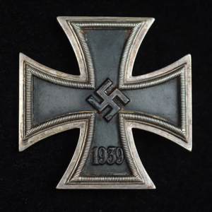 BUY / RESERVE THIS ITEMDescription: 1939 pattern, die struck cross with a single piece iron core and two piece alloy frame. The obverse of the award features an embossed, central, canted, swastika with re-institution date, “1939”, to the bottom arm. The swastika is in nice high relief. The plain reverse of the award has a solid, soldered hinge, and polished straight wide vertical pin that opens close to 90 and not 180 degrees as is typical of these Godet pieces; the marker’s stamp L/50 for ‘Gebr. Godet, Berlin’ is directly below the pin catch. Cross has an ever so slight vault & a very nice patina, having never been cleaned. Godet EK1s are uncommon.