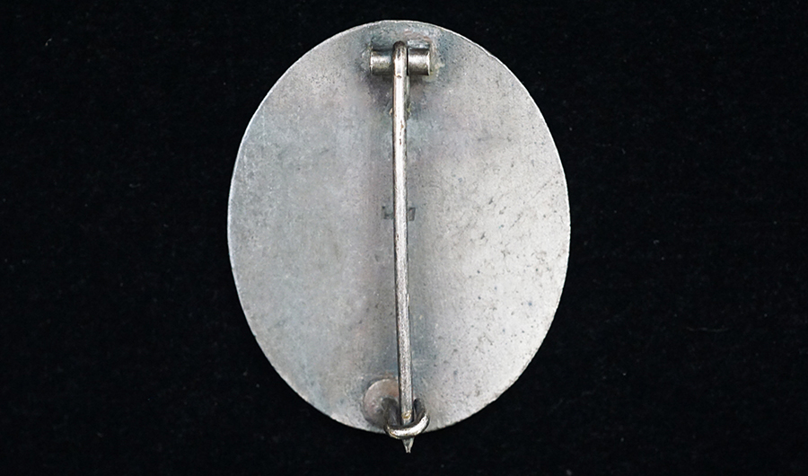 BUY / RESERVE THIS ITEMDescription:. Verwundetenabzeichen in Silber by Deumer; Injection molded, solid back fein-zinc award. The standard issue, 1939 pattern badge is in the form of an embossed, vertically oval, laurel leaf wreath encompassing an embossed M35 pattern helmet with high relief, canted, swastika to the center, superimposed over crossed swords on a pebbled base field. The smooth, solid reverse has a thin round vertical steel pin and an integral, molded, hinge and catch all intact. The reverse is well marked with embossed manufacturer’s numerical code, “L/11”, indicating manufacture by Wilhelm Deumer, Ludenscheid. Badge’s overall finish remains at 90%. Great detail for a zinc badge like this.