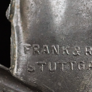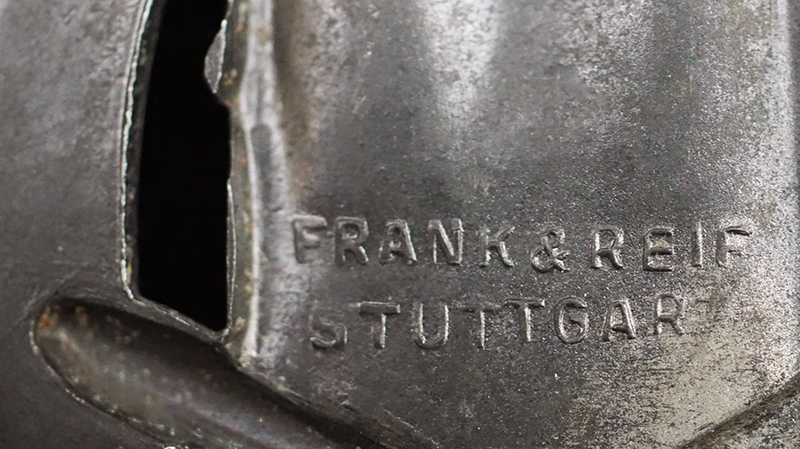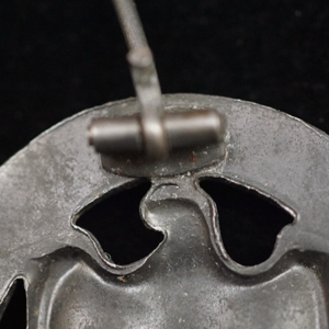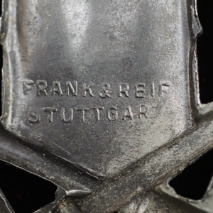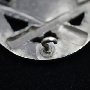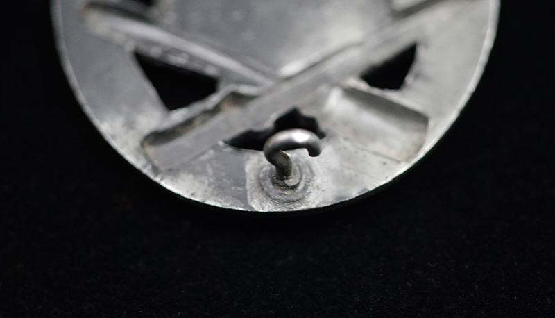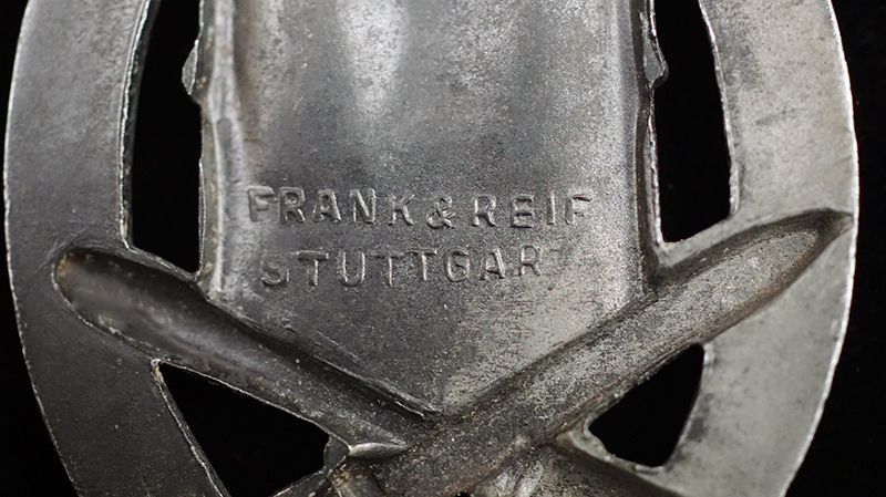 BUY / RESERVE THIS ITEMDescription:. Die struck, scooped-out reveres, fein-zink construction with a silver plated type finish. The badge features a cut-out, high relief Wehrmacht styled eagle with down-swept wings positioned above a crossed bayonet and stick grenade, and encompassed by an embossed, vertically oval, oak-leaf wreath. No cut-outs around the swas, typical of F&R. The hardware is textbook for this maker, with a sheet metal hinge, and round wire pin and catch.Easily recognizable Frank & Rief address logo.