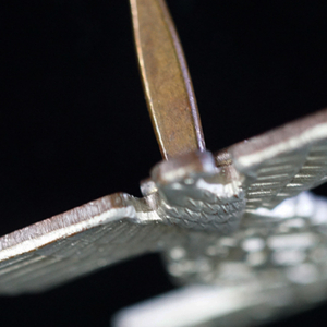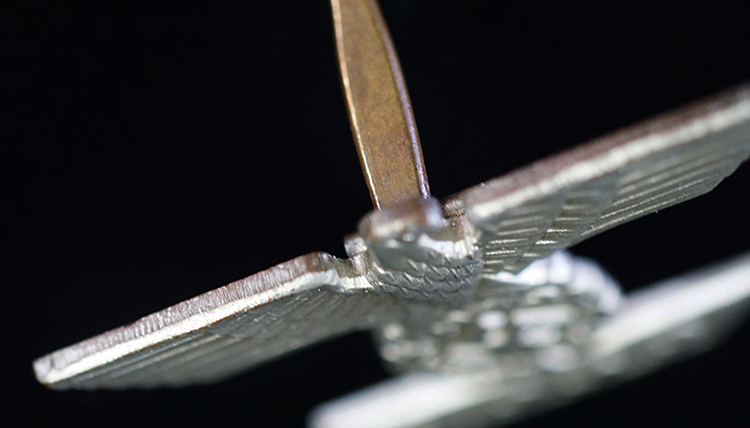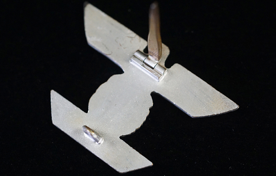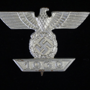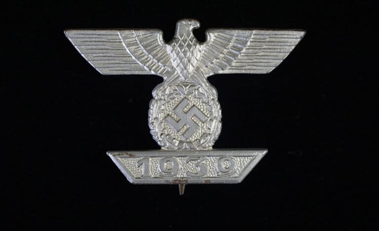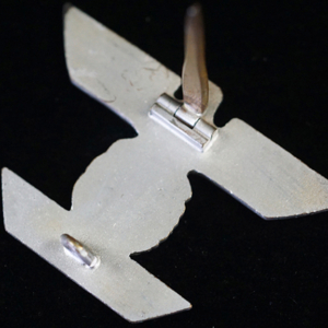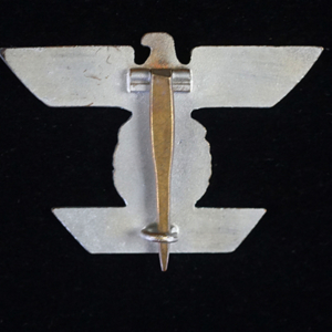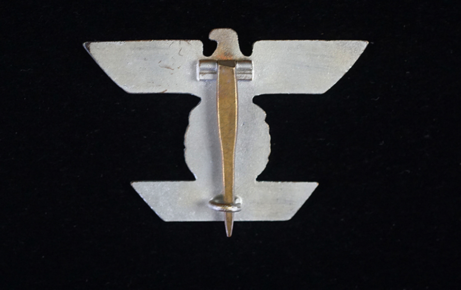 BUY / RESERVE THIS ITEMDescription: Nicely detailed, die struck wartime alloy construction, second pattern, silver finished over cupal award is in the form of a national eagle with outstretched wings, clutching an oak-leaf wreath which encompasses a canted swastika above a horizontal, trapezoidal, date bar with diagonally angled ends, and embossed institution date, “1939”. The award shows nice detailing including feathering to the eagle’s wings and a subtly textured background field to the swastika and the date bar. Complete with original hinge, wide pin and catch assembly; measuring 44.2 mm (w) x 30.5 mm (h), weighing 10.8 grams,