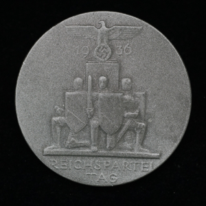 BUY / RESERVE THIS ITEMDescription:.Alloy pin-back event badge for the 1936 Reich Party Day event. Solid back, Silver finish; Reverse well marked with maker G.Danner, Muhlhausen-Thuringen.