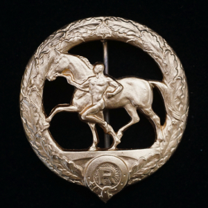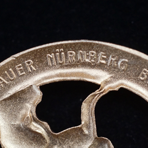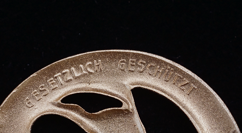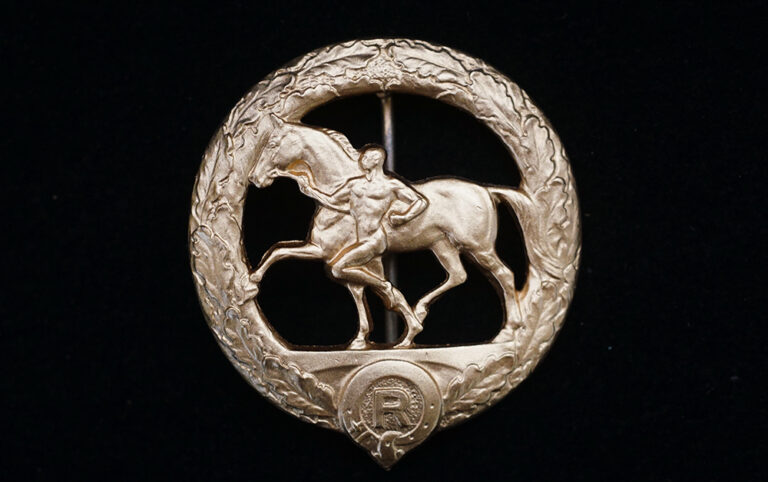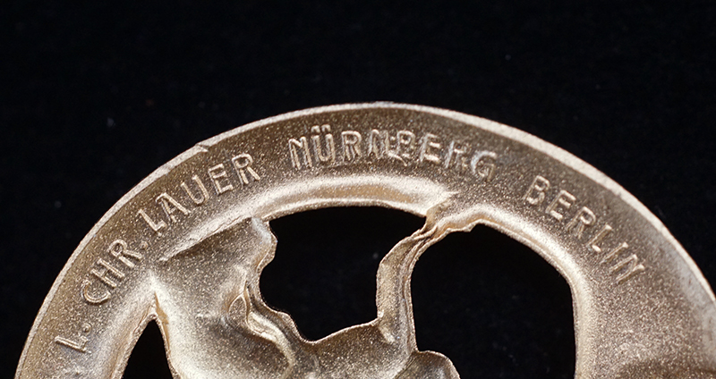BUY / RESERVE THIS ITEMDescription: Pre-war Third Reich Badge for Care of Horses (Deutsches Pferdepflegerabzeichen) badge in Gold by “L. Chr. Lauer, Nürnberg”. Rare early Gold finished tombac Pferdepflegerabzeichen in near mint condition. Shows nearly all its gilt finish. Typical ‘L. Chr. Lauer’ hinge & pin assembly. Reverse with typical makers name, address & ‘Gesetzlich
