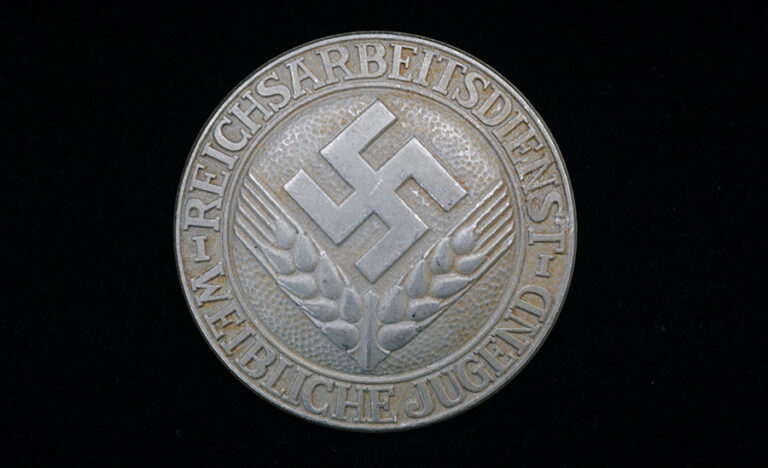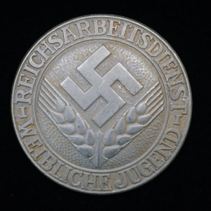 Description: Reichsarbeitsdienst der weiblichen Jugend Brosche für Arbeitsmaid ( Pflicht); Silver-gray Brooch-badge for RAD female youth by ‘Paulmann & Crone, Lüdenscheid’. Pin-back aluminum; marked 37 ‘RAD Weibliche Jugend’ brooch with crimped pin. Maker marked with the PC logo and RJD mark underneath. Near mint.