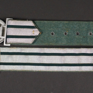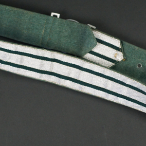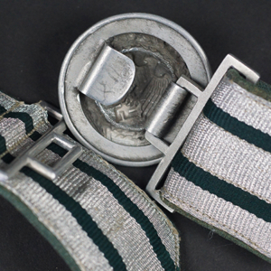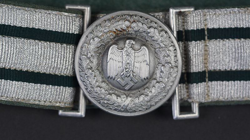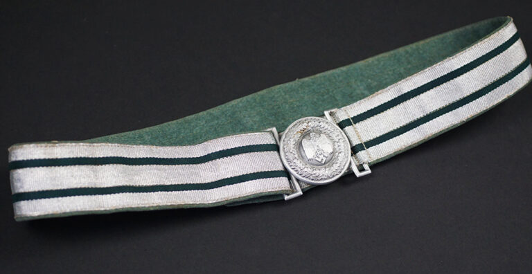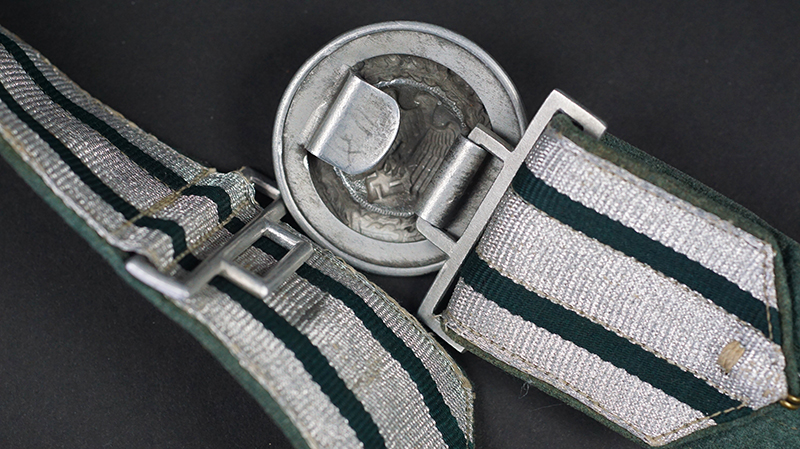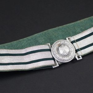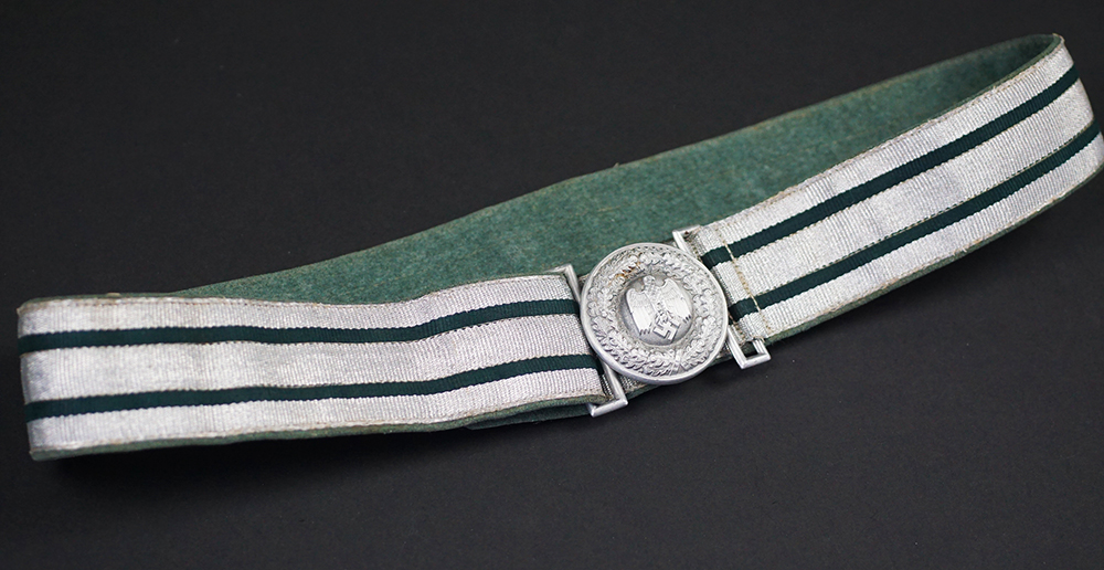 BUY / RESERVE THIS ITEMDescription: Nice quality, roughly 46mm wide, bright, silver/aluminum brocade belt. The belt comes with a two piece die stamped aluminum construction, circular belt buckle. The unmarked buckle features a highly embossed oak-leaf wreath encompassing a central Heer style eagle; The reverse of the buckle is a mirror image of the obverse and has a separate, circular plate insert with a crimped catch and retaining hook. The circular plate is secured by the crimped outer edges of the buckle’s obverse. Belt is adjustable to size 33”. Excellent to near mint condition!