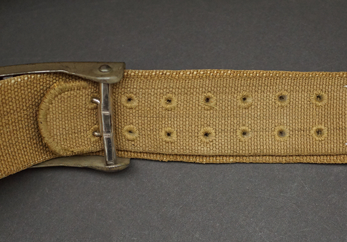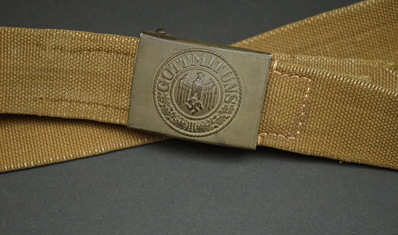 Background: Originally all EM/NCO’s belts were produced in a blackened leather until late 1940, with the impending German entrance into the North African campaign, tropical uniforms and equipment were quickly developed and issued in time for DAK, Deutsches Afrika Korps, personnel’s arrival in Tripoli in February 1941 and included a canvas web constructed waist belt. Due to the extreme climate in North Africa the OKW, Oberkommando der Wehrmacht, decided to replace the standard continental leather equipment items with canvas web construction items in the belief that they would be better able to withstand the climate. Eventually, due to leather shortages, many of the tropical uniform and equipment items would be issued to personnel serving in southern areas of continental Europe and other Mediterranean theatres of battle. Another later war expedient type was the production of preßstoff, (Pressed Cardboard), and other ersatz material belts. The ersatz construction belts were only issued in limited quantities.