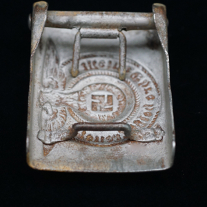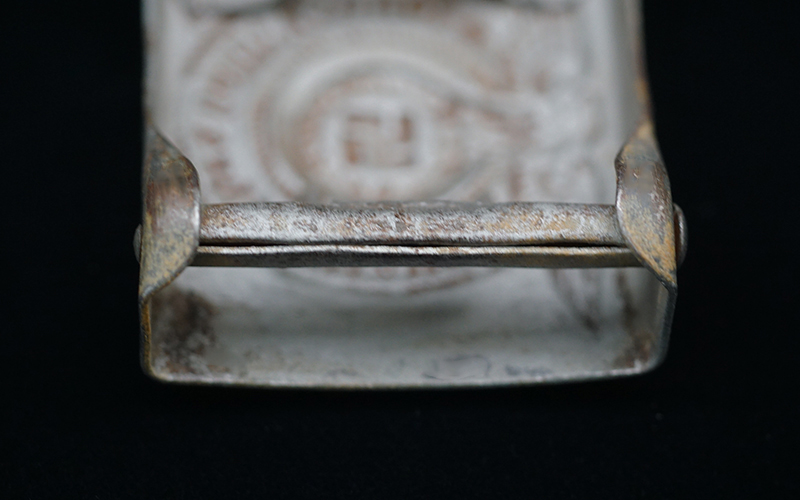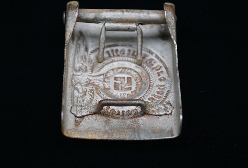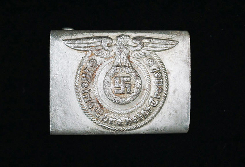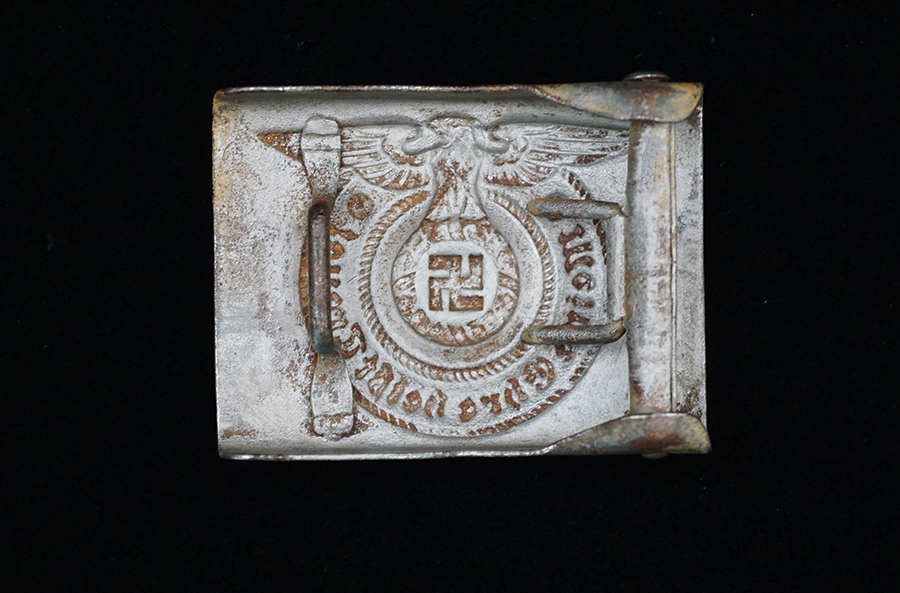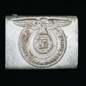 BUY / RESERVE THIS ITEMDescription: Steel enlisted Waffen-SS belt buckle an unmarked ‘Overhoff & Cie’’; buckle retains approx. 70% of its obverse & 65% of its reverse silver finish. A great field-worn WSS steel combat buckle that’s ‘been there’.