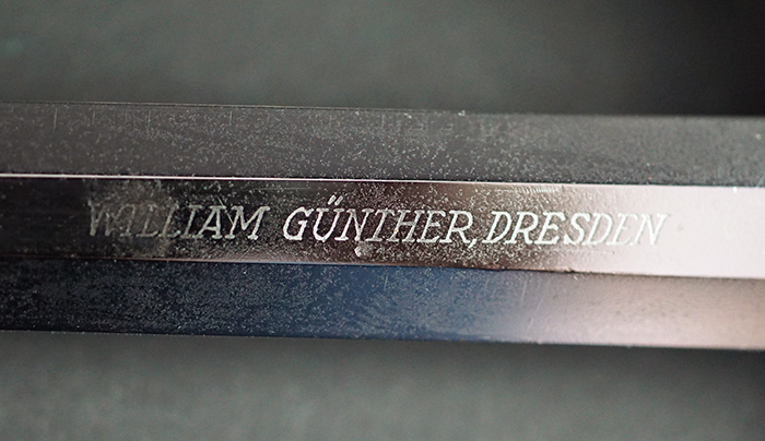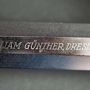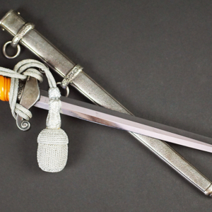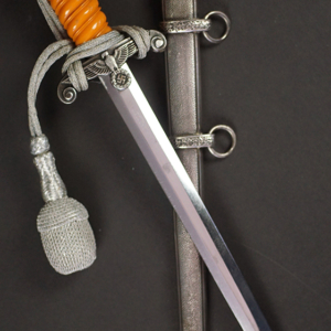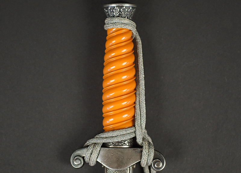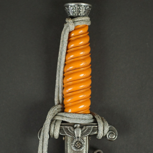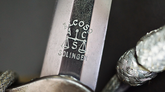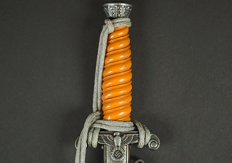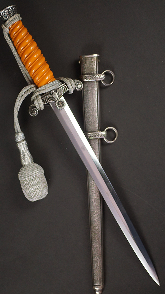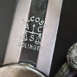 Description:  This scarce dagger with distributor marked blade is in nice condition throughout, with textbook Alcoso mounts that all match in their detail & deep dark patina. The grip is a fine example with a dark pumpkin orange appearance. The Alsoca Cross guard is the 1937-40 period  type. The blade is excellent from the same period (1938-40) as indicated by the arched-Alsco logo; its obverse revealing one of the better known distributors. The scabbard retains both side screws and has a perfect silvering and crisp detailing throughout the pebbling and the bands, matching in patina with the crossguard, ferrule band and pommel. The original leather washer is in place; comes with its Officers portepee.