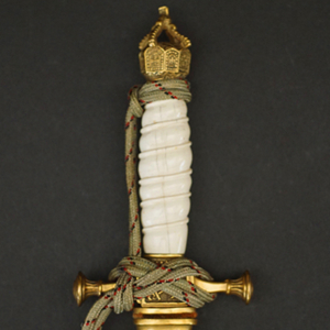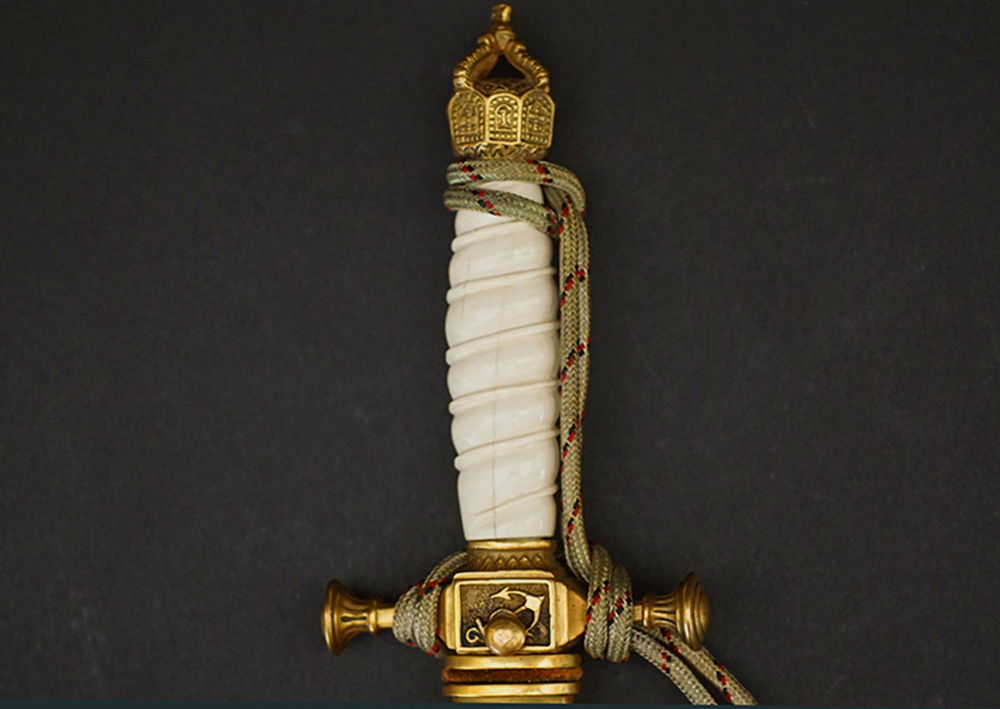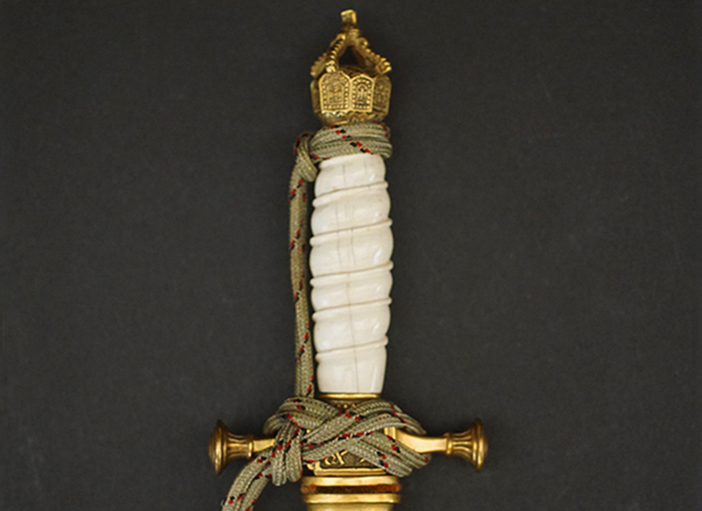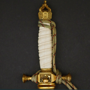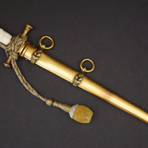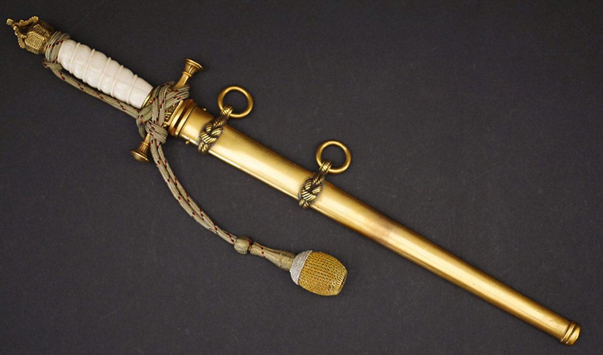 BUY / RESERVE THIS ITEMDescription: Model 1902 Reichsmarine Naval Dirk by Eichhorn having an exquisite Ivory grip and tri-color officers Portepée. Early Eickhorn double squirrel logo at the ricasso of its double etched blade. Open crown pommel and detailed cross guard both having most of their gilt finish. very uncommon straight, smooth scabbard that retains nearly all of its fine gilt finish.16.5 inches overall. A beautiful early example.
