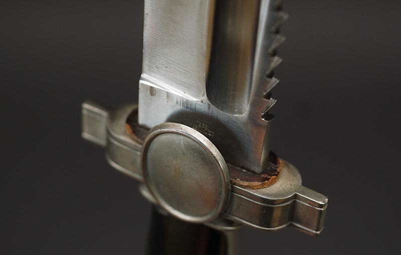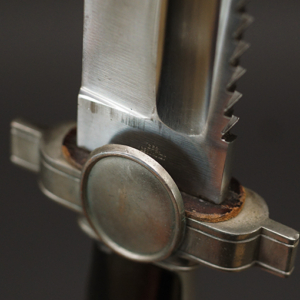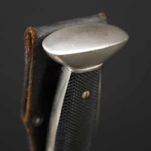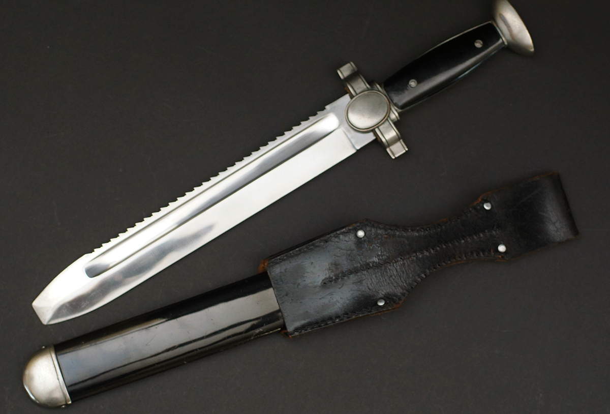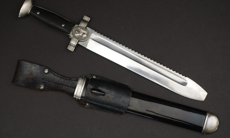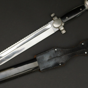 Description: This exceptional Red Cross hewer is a real beauty and features a superb 10 1/2″ long, broad squared, blunt tipped, nickel/silver plated, forged steel blade with deep, wide fullers and a staggered, saw-toothed edge. The leather washer remains in-situ at blades ricasso. The cast alloy cross guard, languets, and pommel all have a matte, nickel/silver plated finish that remains 100%.. The obverse, vertically oval languet has a raised, smooth outer edge encompassing an embossed second pattern, (Circa 1938-1945), DRK style national eagle. The hewer has molded, black, bakelite grips held in place by two, countersunk screws. The obverse grip features a repeating, diamond grooved pattern and the reverse grip is plain. The hewer comes with its original, black lacquered steel scabbard with matte, nickel/silver plated top and bottom fittings. Both the top and bottom fittings are secured to the scabbard by two, small, dome headed screws. The scabbard’s black finish and nickel plated fittings all remain 100%. Just a beautiful example of this dagger. Complete with its original frog. Hard to upgrade this one.