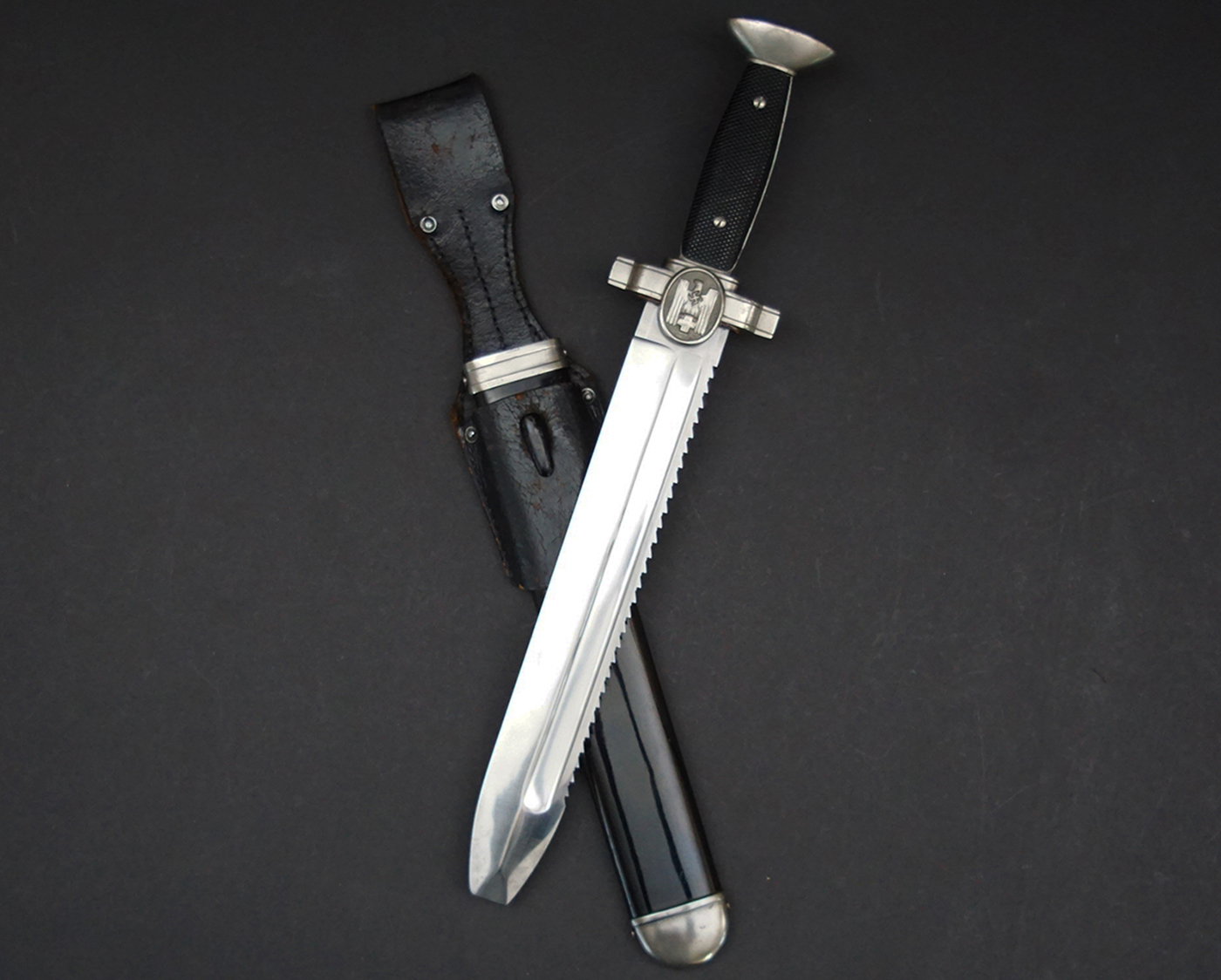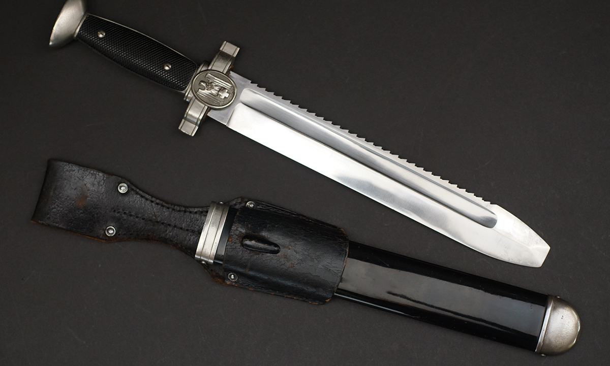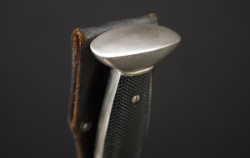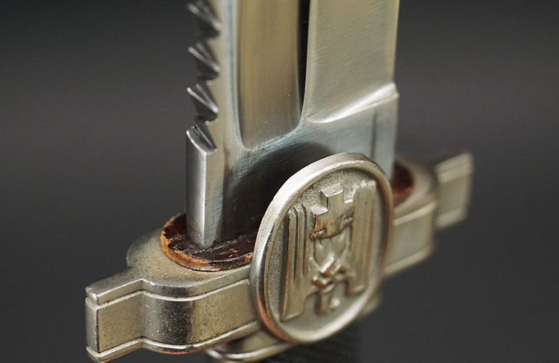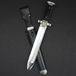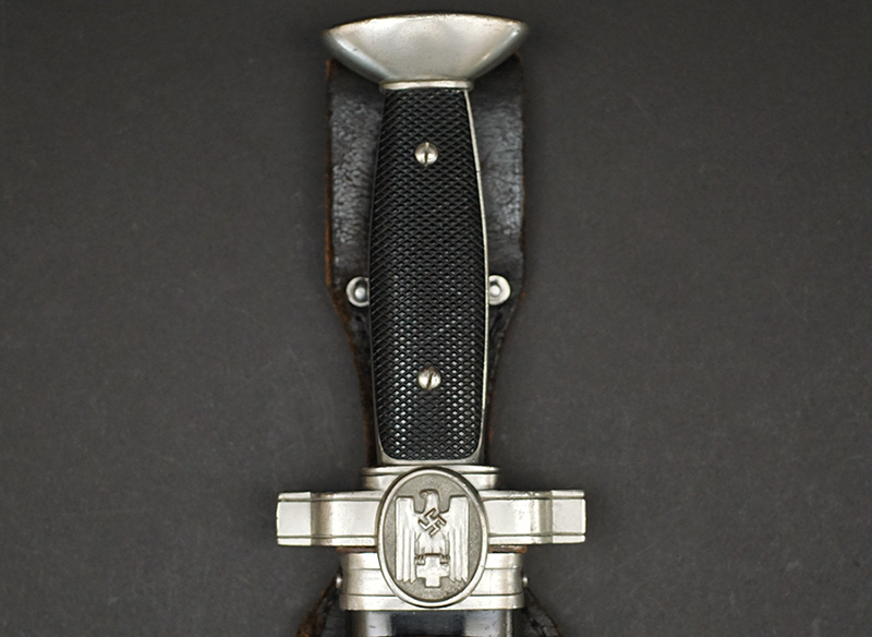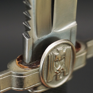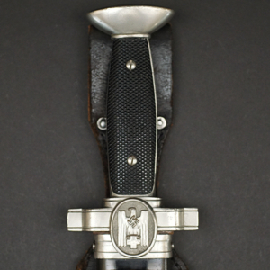 Background: The DRK, “Deutsches Rotes Kreuz” (German Red Cross), a voluntary civil assistance organization originally instituted in 1864, was officially acknowledged by the Geneva Convention in 1929, and in December of 1937 it was legally recognized by the NSDAP, becoming controlled by them a year later under the auspices of the Ministry of the Interior’s Social Welfare Organization. Due to its non-combatant status, it had to conform to the international Geneva Convention, which directed that its members not carry any weapons, including edged weapons. As a result, the DRK Subordinate’s hewer, introduced in 1938, was designed with a squared tip to preclude its classification as a weapon, allowing its wear in the field. It was worn by the ranks of “DRK-Anwärter” to “DRK-Haupthelfer”.