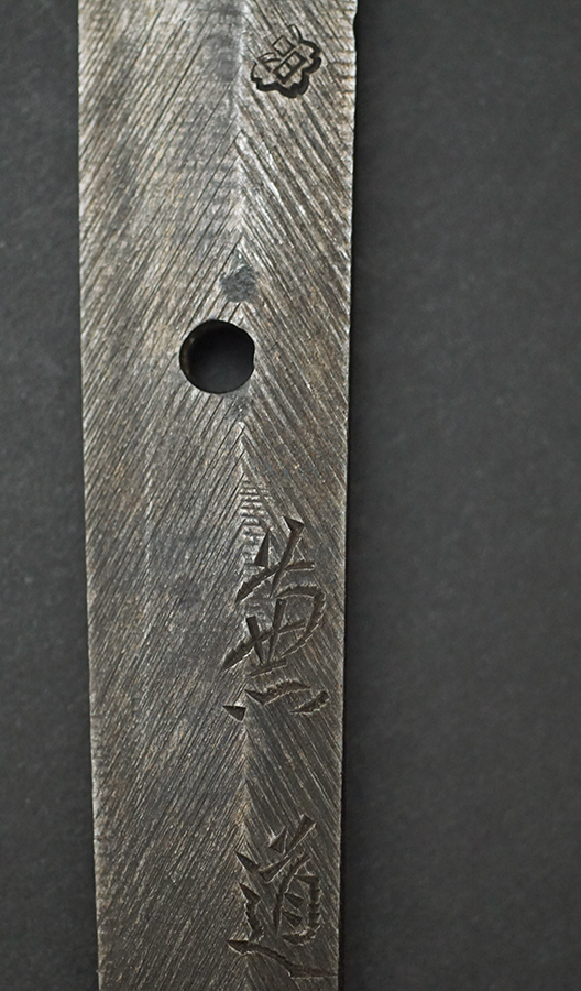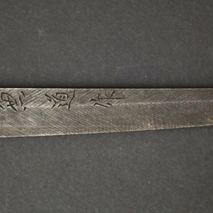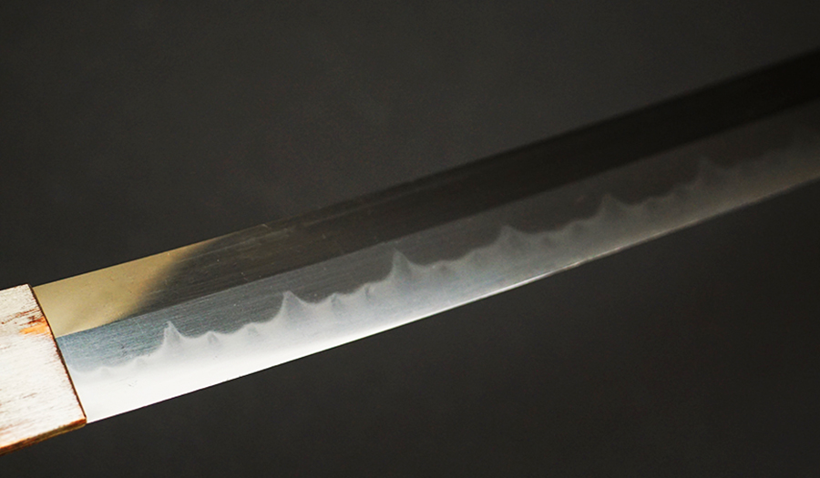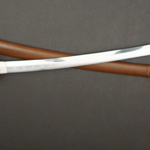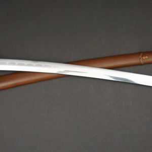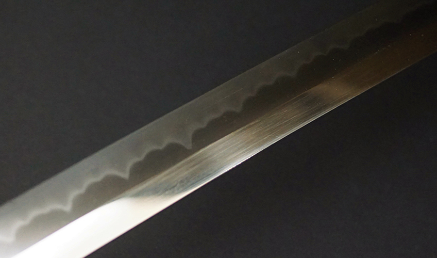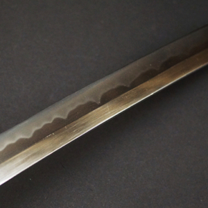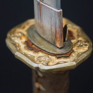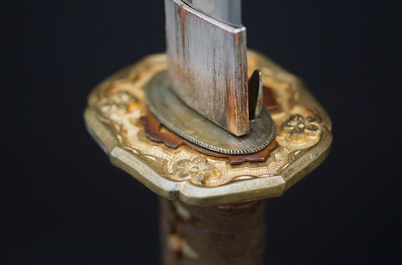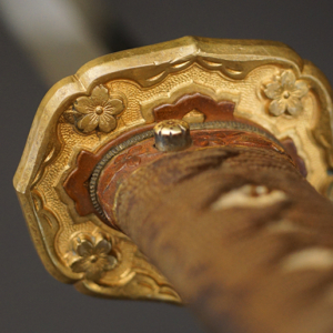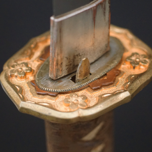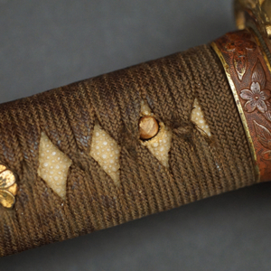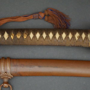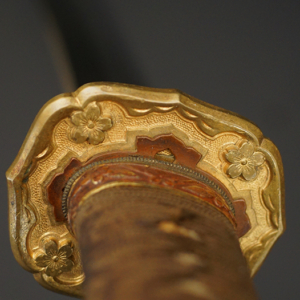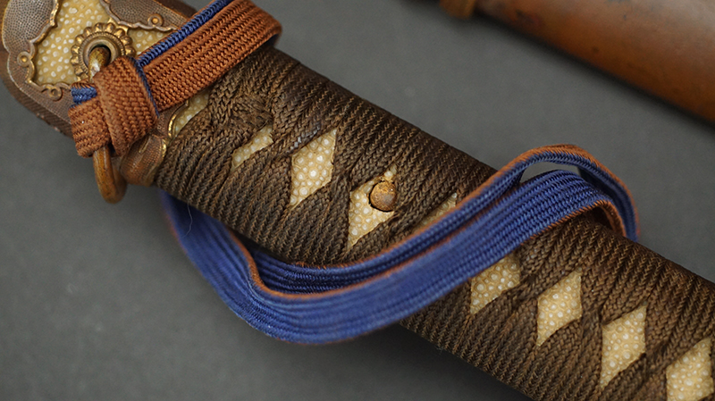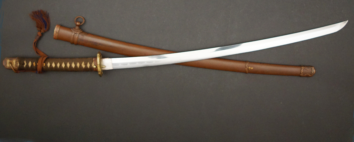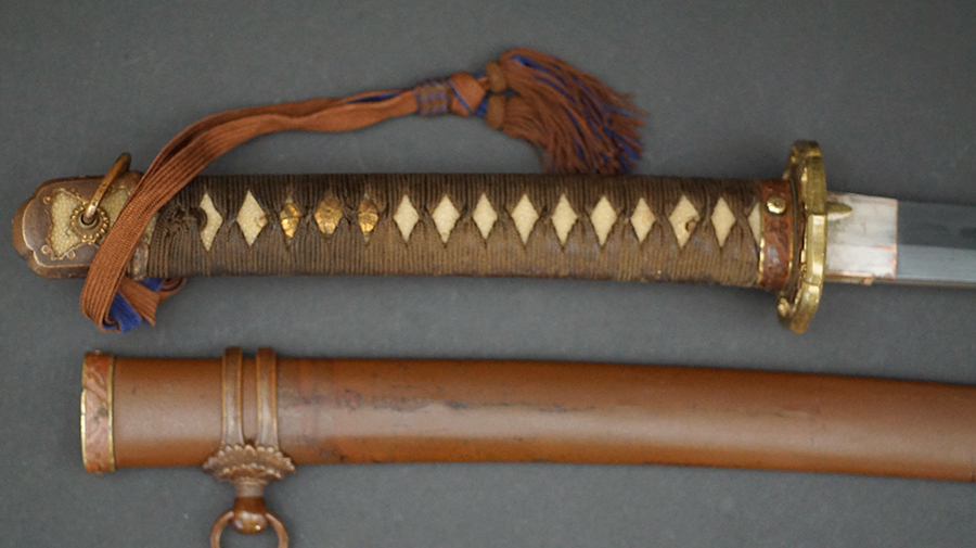 BUY / RESERVE THIS ITEMDescription: This wartime officer’s sword measures 38½” overall and bears a 27¼ ” shinogi-zukuri blade showing a striking mirror polish, beautiful gunome hamon; The tang is dated August 1940 (year 15 of the showa era; “Hachigatsu Jugo-nen”) tang signed ”Kane Michi Saku; arsenal (turtle) stamp -Seki Cutlery Manuf. Assoc, blade is razor sharp and near mint. The officer’s mounts are of exceptional quality and condition, comprising a silver-plated habaki and gilt brass tsuba, fuchi, menuki and kabuto-gane with ocher-brown matte finish on the fuchi and kabuto-gane. The wood grip is bound in traditional white shagreen and brown cloth tape. Superb, unfaded company-grade officers tassel in-situ. The scabbard is near mint, featuring a medium brown-painted steel body and ocher-brown-painted gilt brass mounts matching the hilt and showing only the barest light finish wear at the exposed edges of the mounts. Overall length seated: 40”.