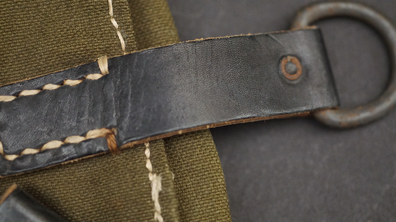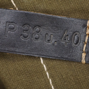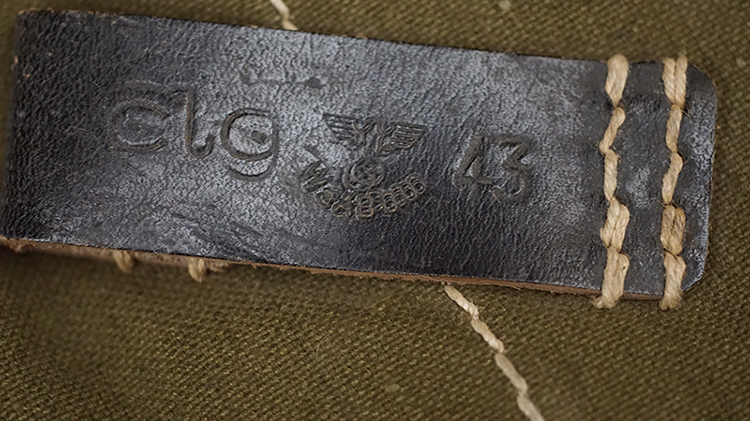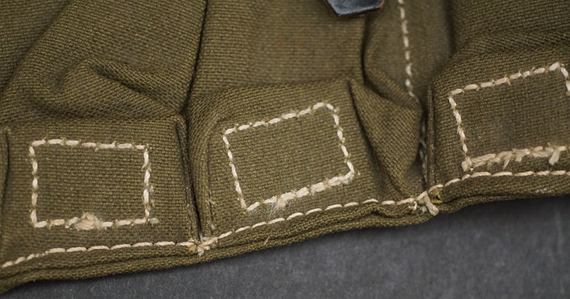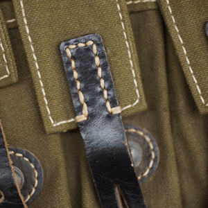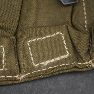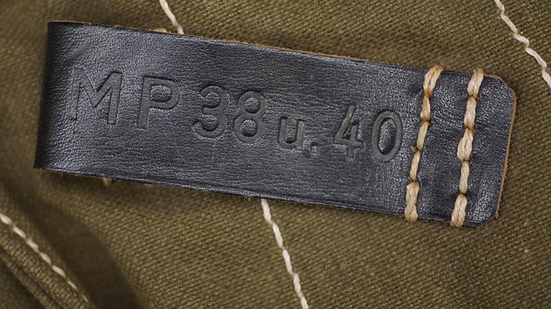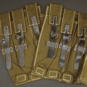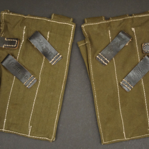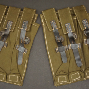 BUY / RESERVE THIS ITEMDescription: Mint unissued pair of MP40 magazine pouches, maker code ‘clg’ + ‘WaAB66’(Ernst Melzig, Lederwaren, Liegnitz-Polen) and dated 1943; matched set, left & right including loader compartment; made of thick deep olive colored cotton, belt loops and closure straps are black leather stitched with white cord, the belt loops are stamped with maker ‘clg 43’ and Waffenamt, the other loop is stamped MP. 38 u.40, D-ring and studs are steel,mint matched set with no issues!