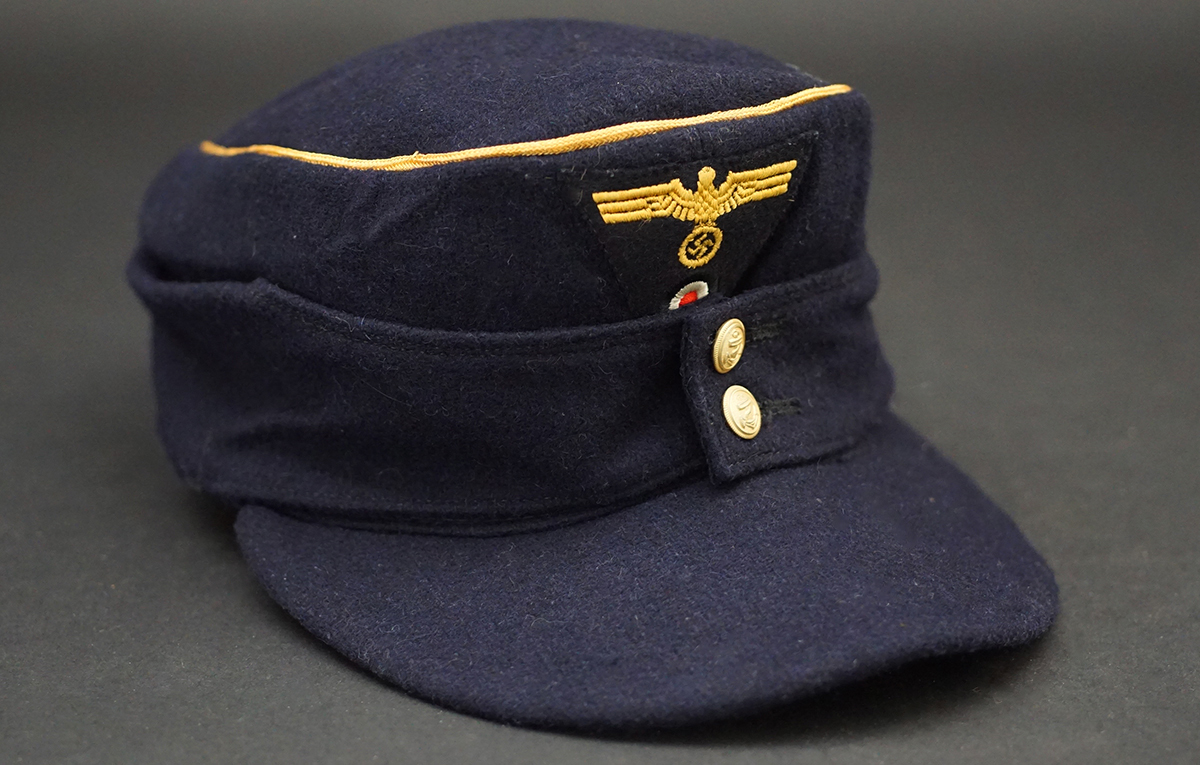 Description: Superb Kriegdsmarine issue Dark blue officers M43 cap, made of quality navy blue wool, with black rayon lining and white ink stamped size 56; factory integral gold cellon crown piping and two gold KM anchor cap buttons sewn to the front, gold embroidered cap eagle & rosette trapezoid correctly machined to front. Appears as unworn, KM Dark blue Officer M43 caps are rare and seldom found on the market; only the second one we’ve had in years