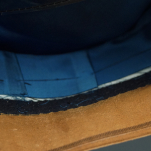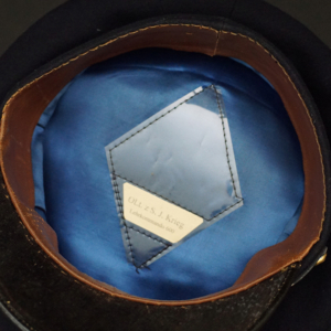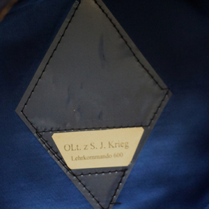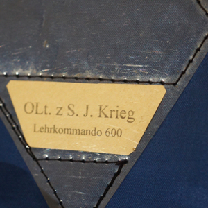 Description: Attributed Kriegsmarine officer visored cap for rank of Leutnant Zur See to Kapitänleutnant; this cap is named to Olt. z.S.J.Krieg -Lehrkommando 600; the removable cap body is made of high quality dark blue colored wool, with the standard black mohair type cap band, having a black patent leather chinstrap held in place with two gilt anchored buttons, the visor’s upper side is covered in dark blue wool onto which is embroidered the scalloped rank decoration in gilt wire, the visor’s edge and lower surfaces are covered in black oilcloth, the national emblem is hand embroidered in gilt wire with thread highlight onto a dark blue colored wool backing and is carefully hand sewn to the cap, the wreath and rosette are embroidered in toned gilt wires onto a dark blue colored wool backing and is also hand sewn into place; a black patent-leather KM style chinstrap fastened at each end to the cap band complete the front of this great cap.. The interior is lined in a medium blue colored rayon and has a plain and intact celluloid sweat diamond with ID name & unit under it. Cap has a brown leather, vented brow sweatband, approximate size is 55, cap has a great floppy KM shape and is a real one-looker!