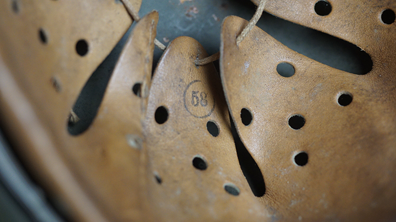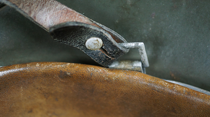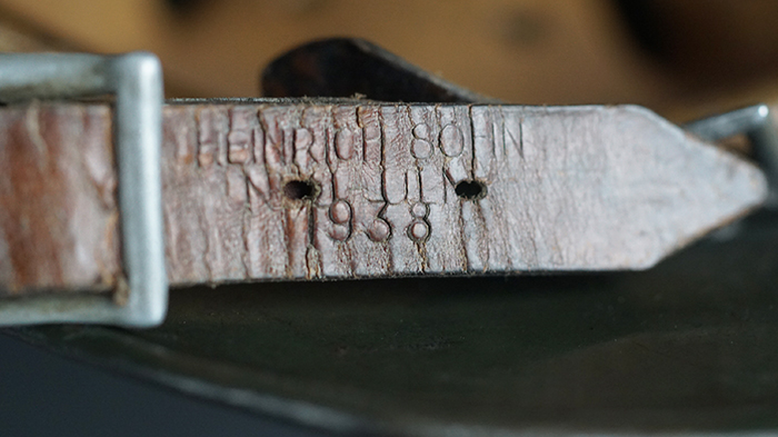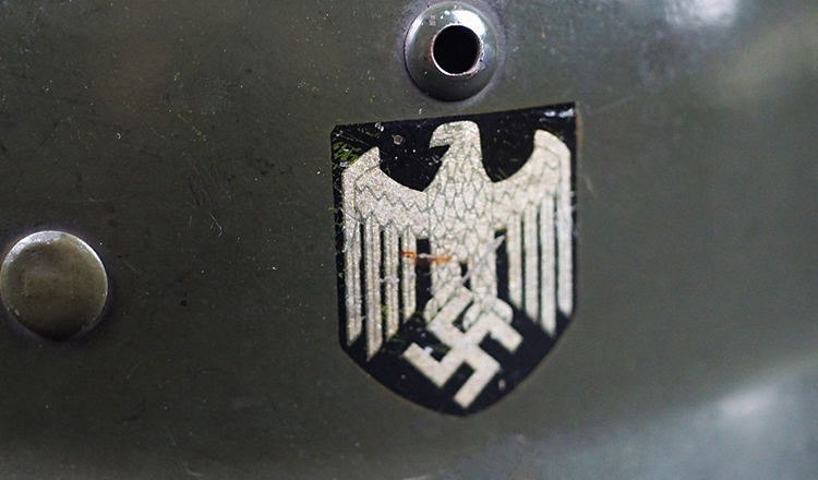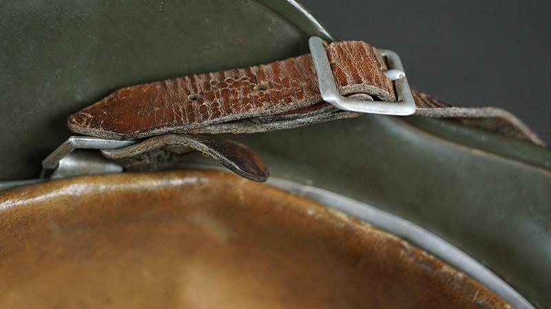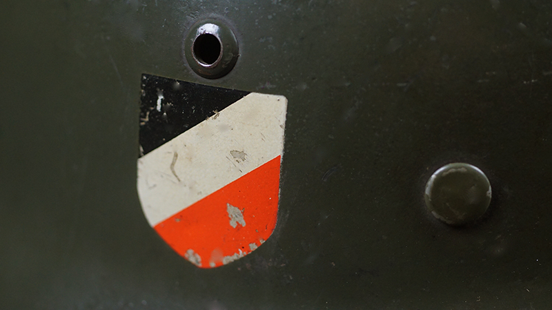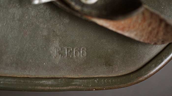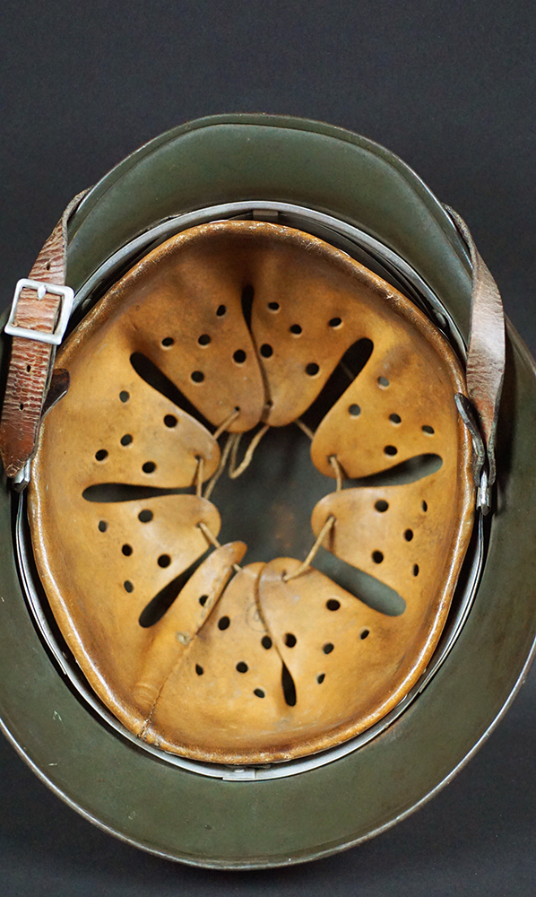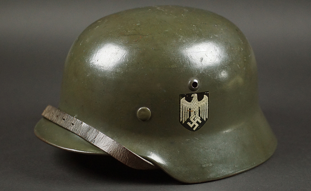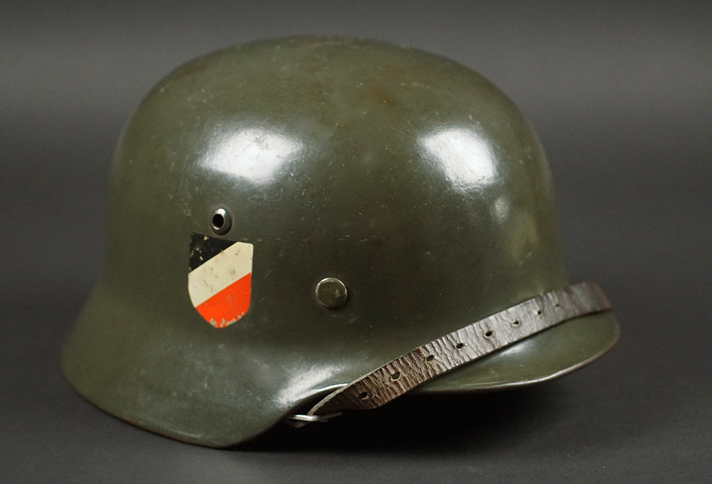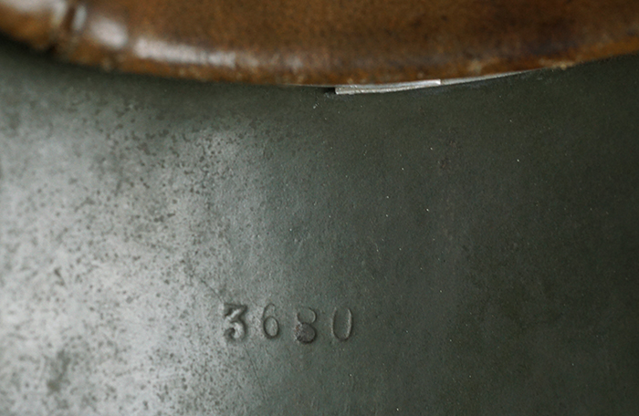 Description: An outstanding M1935 Double Decal Heer Helmet that remains completely untouched. Its early apple-green paint remains at 99%! The left side of the helmet has a 99% early Heer eagle decal and the right side a 98% national tri-color shield. All three liner split pins & bushings are fully intact, tight and untampered-with. The interior of the helmets has a light tan, M31 leather liner stamped size 58, with all eight fingers and its original tie string. Its aluminum, liner band remains as tight as the day it was assembled. Its original Chinstrap is marker marked & dated “1938” The interior crown of the helmet faintly retains its oval, “Beschaffungsamt” ink stamp. The interior reverse neck skirt is lot number stamped, “3680”. The interior left side skirt is stamped with the manufacturers code & size “E.F.66”, for manufacture by Emaillierwerk, AG Fulda, size 66. An outstanding example, getting harder to find.