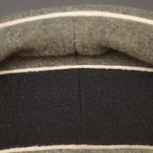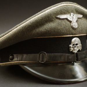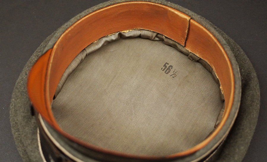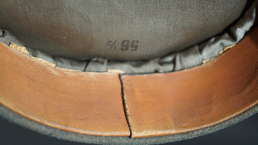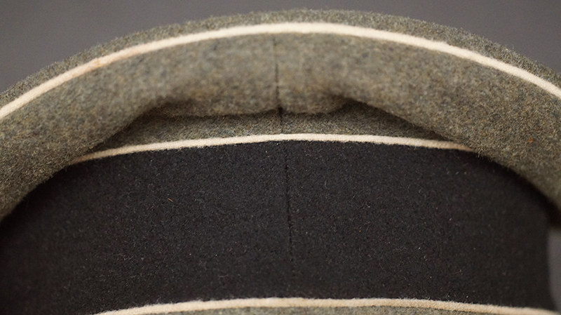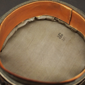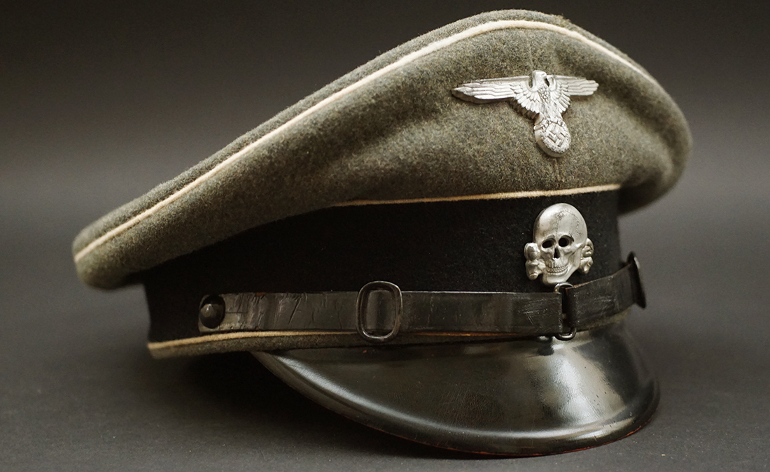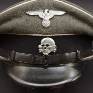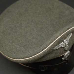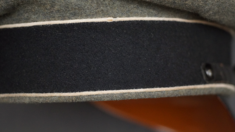 Description:. Choice Waffen-SS NCO visored cap with feldgrun wool body, black wool cap band and white wool piping throughout. Black vulcan fiber visor showing fine crazing and spidering with typical checkered rust colored underside (right corner with subtle thumb-print wear.  SS style black leather chinstrap with center hinge secured with two domed black enamel side buttons. Matching rare aluminum (cupal) eagle & totenkopf insignia tightly affixed with no prongs protruding through the lining. Lining fabric is a shiny grey-colored rayon marked only with the size 56 ½ in black. Beige leather sweatband is complete and remains tight having period German Newsprint tucked under it to decrease size a bit. No apparent insect issues with only the slightest age/handling wear. A real one-looker!