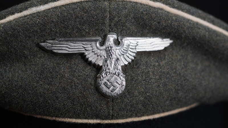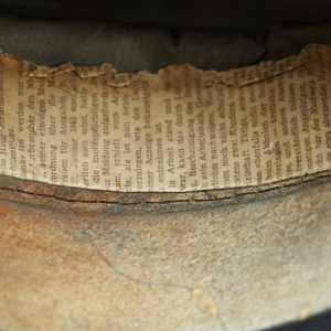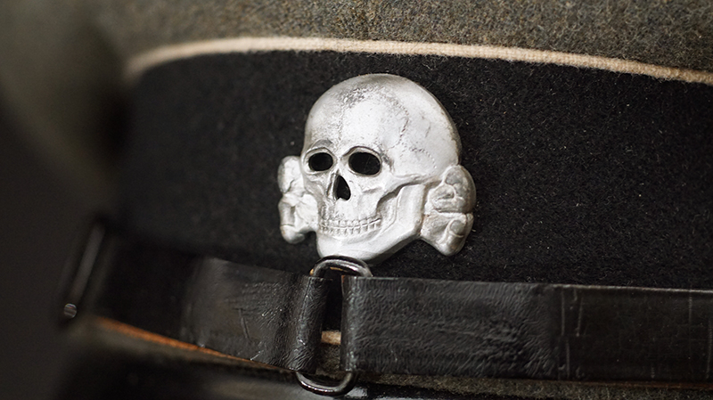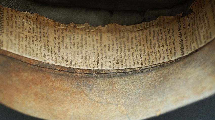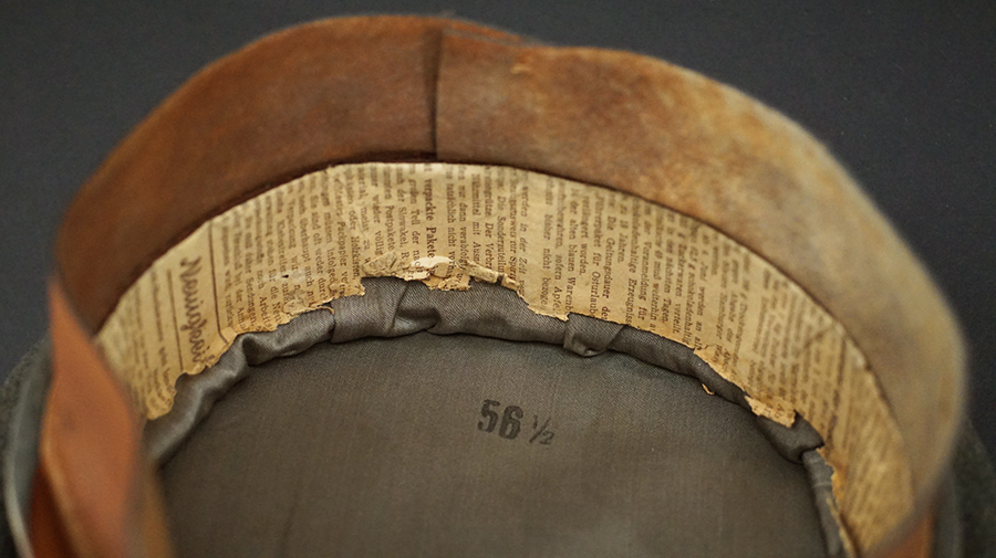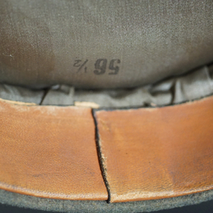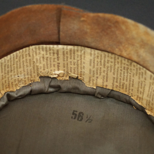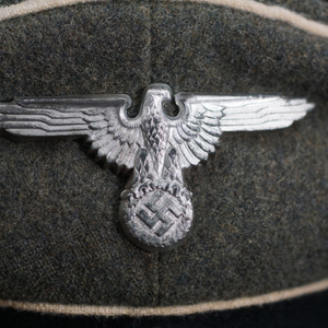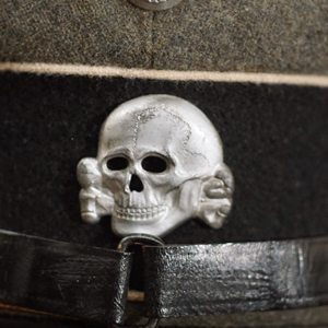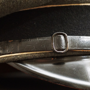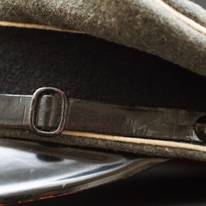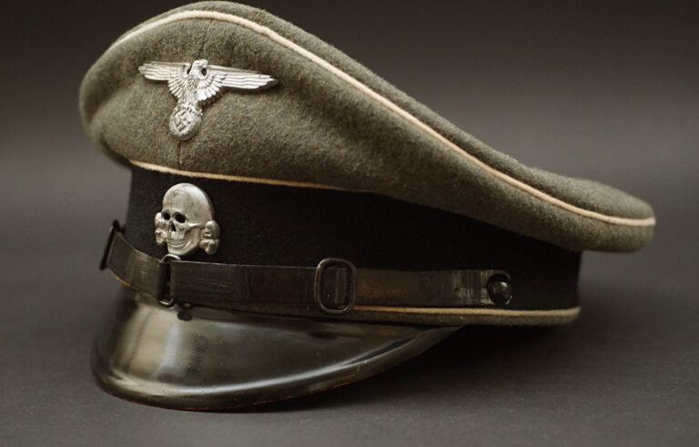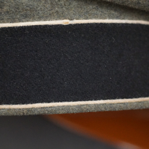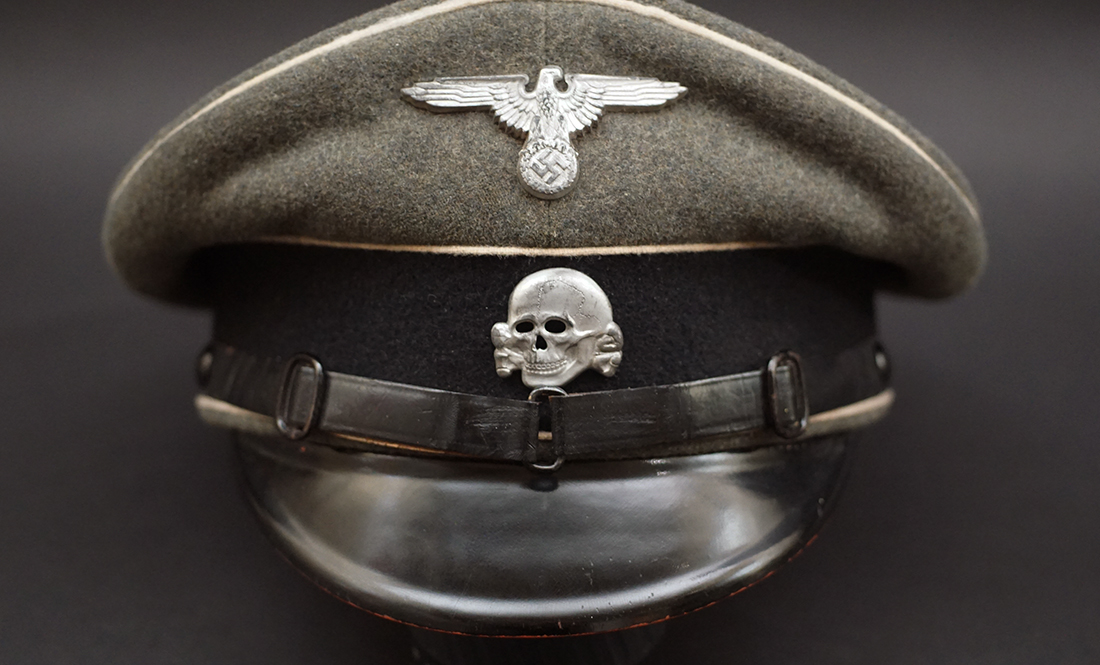 Description:. Choice Waffen-SS NCO visored cap with feldgrun wool body, black wool cap band and white wool piping throughout. Black vulcan fiber visor showing fine crazing and spidering with typical checkered rust colored underside (right corner with subtle thumb-print wear.  SS style black leather chinstrap with center hinge secured with two domed black enamel side buttons. Matching rare aluminum (cupal) eagle & totenkopf insignia tightly affixed with no prongs protruding through the lining. Lining fabric is a shiny grey-colored rayon marked only with the size 56 ½ in black. Beige leather sweatband is complete and remains tight having period German Newsprint tucked under it to decrease size a bit. No apparent insect issues with only the slightest age/handling wear. A real one-looker!