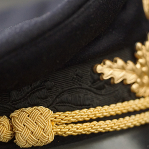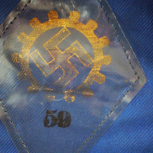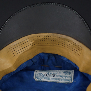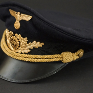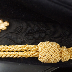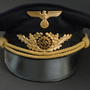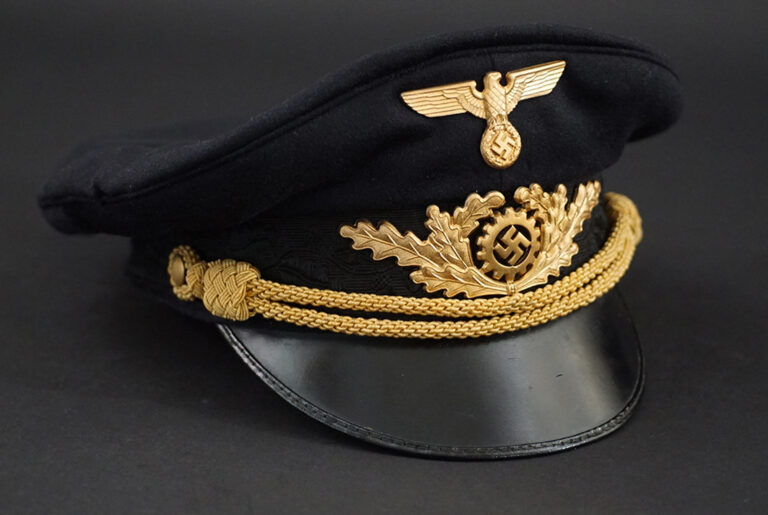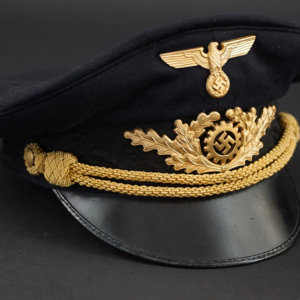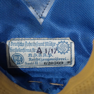 BUY / RESERVE THIS ITEMDescription:. Fine blue/black doeskin wool visor cap having a matching gold eagle & wreath cap badge set, gold chin cord & cap buttons; cap band of black woven silk undulating oak leaves & acorns. Double black crown eyelet vents per side. Black viber visor with black edge trim (as on Luft & KM visors). Interior lining of cap is Cornflower blue ribbed silk, full eisenglass shield w/ entered gold DAF gear logo and size stamp 59. Lining further has a full white oilcloth DAF Mütze RZM tag; quite scarce, in near mint condition and the first we’ve seen in years.