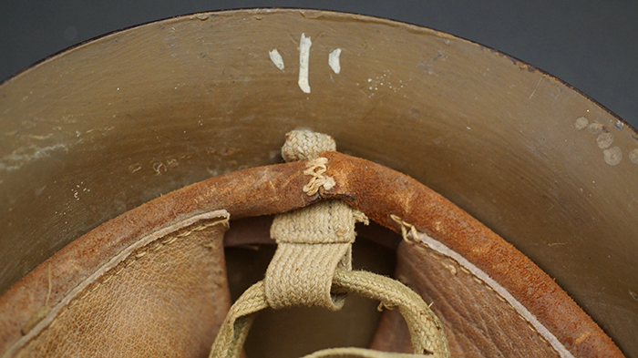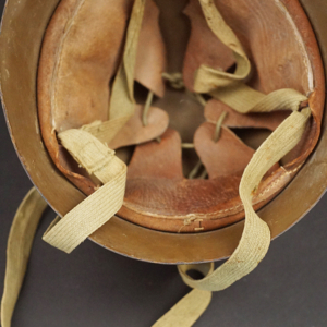 Description:. This excellent to near mint Imperial Japanese Army M32 Combat Helmet is the type used throughout WW2. It retains 99% of its original flat, OD painted finish inside and out with separately applied IJA Star to front.Thick tan Leather 3-piece liner & liner band are near mint along with excellent full length double 20mm wide Chin-strap ties that connect to the typical 3-snap rings found on these helms. A superior example inside and out that would be tough to upgrade!
