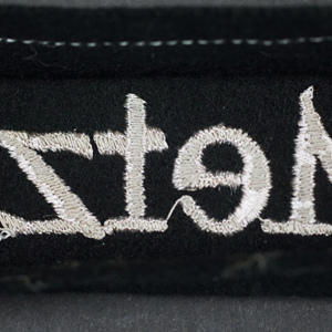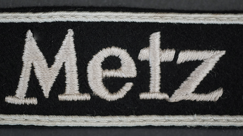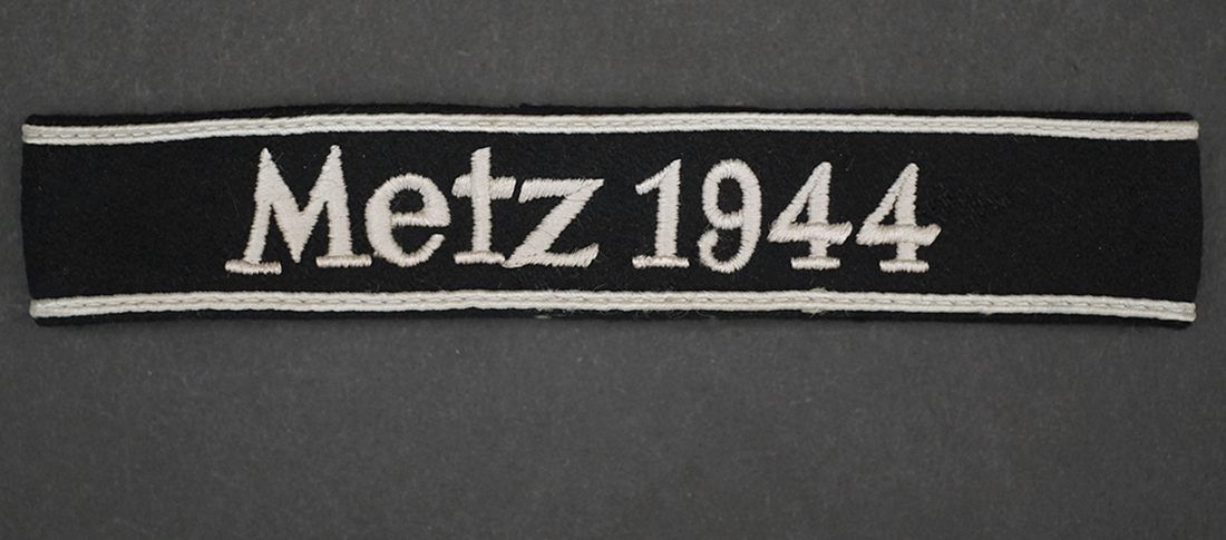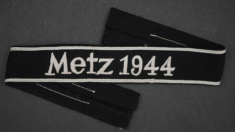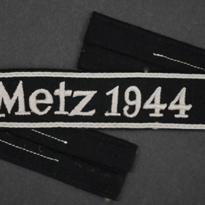 Background: The cuff title was instituted on October 22, 1944. The awards were not presented until February 18, 1945, to the surviving officer cadets and staff of the Metz War School, with approximately 250 recipients; no doubt some more were manufactured but the “Metz 1944” cuff title is undoubtedly one of the last and rarest decorations of the Wehrmacht.