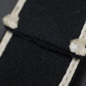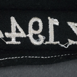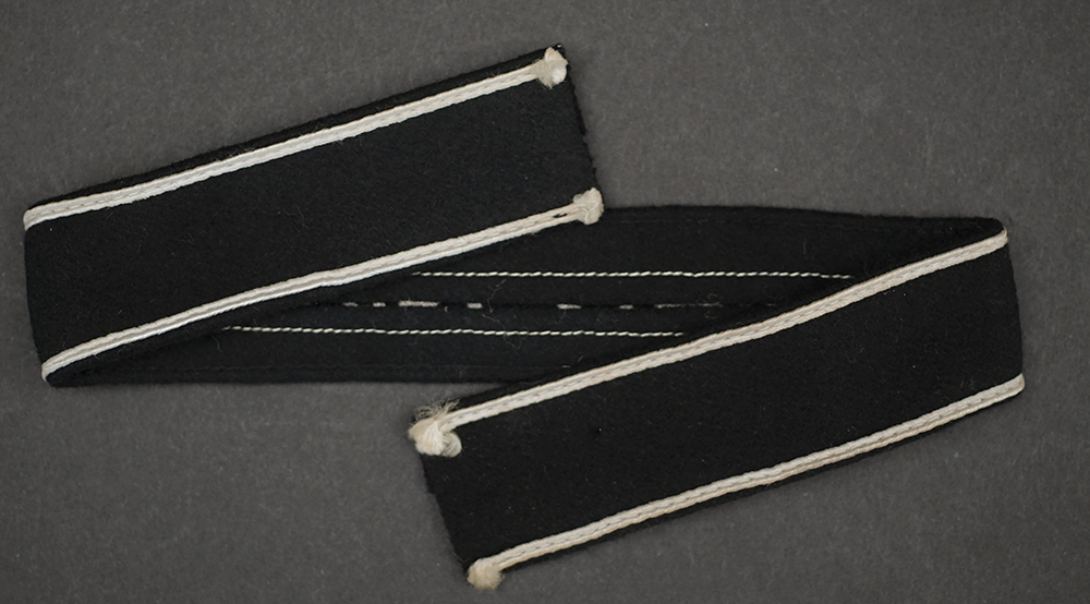 Description: By far the rarest of the campaign cuff titles. This original issue full-length (42 cm) example has the unique machine embroidery-styled silver-gray thread block lettering on thick black wool w/Russian-braid edge;