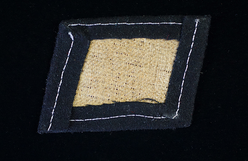 BUY / RESERVE THIS ITEMDescription: Near Mint textbook WSS-Volunteer right side collar tab for the 29th Division; black wool construction with typical thin buckram backing having and obverse bright ‘silver thread’ design of a Maltese cross with crossed swords; These and other types were exclusively manufactured-at, found & brought back by GIs from the Bekleidungswerke at Dachau.