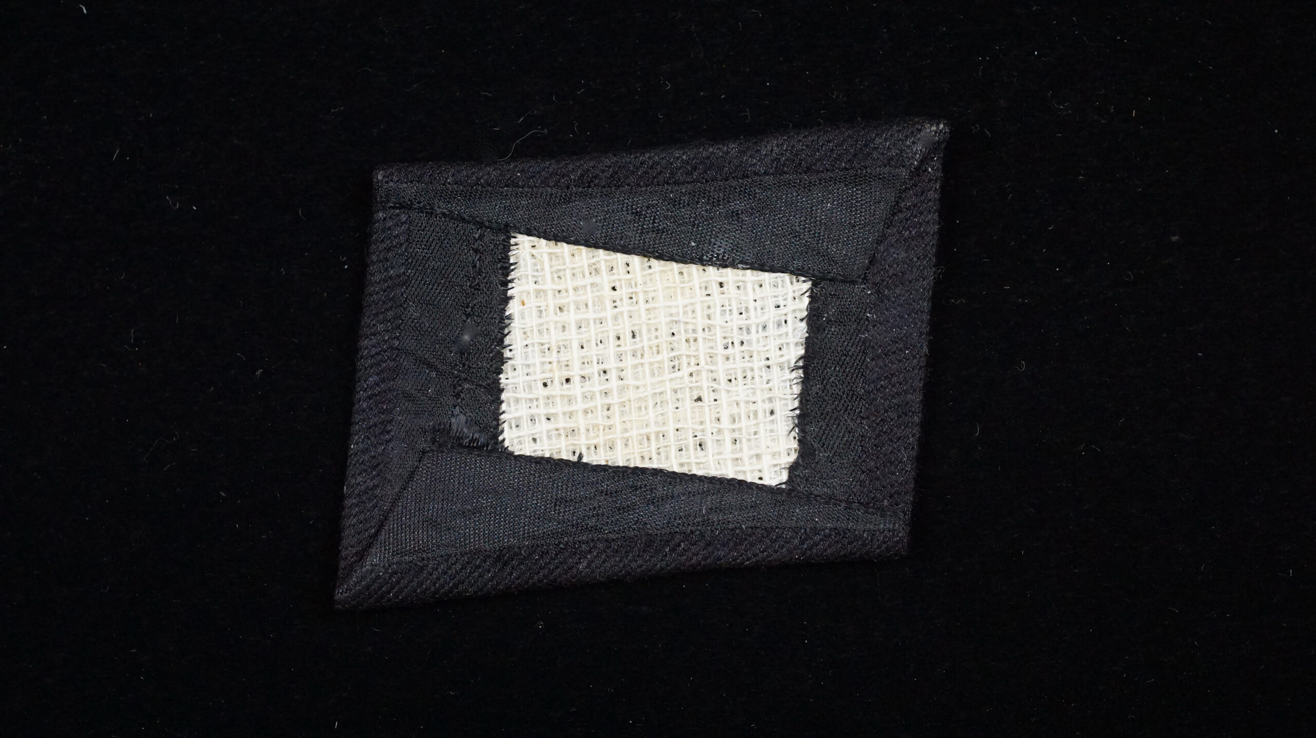 Description: SS Runic Collar Tab that is the third and final pattern (Circa 1940-1945); un-piped, black ribbed rayon construction collar tab with machine woven, (BeVo), SS runes in silvery/white rayon thread. The collar tab is mounted on a white mesh buckram base. This style of collar tab was generally worn by all enlisted & NCO ranks. The collar tab is in Mint unused & a perfect example.