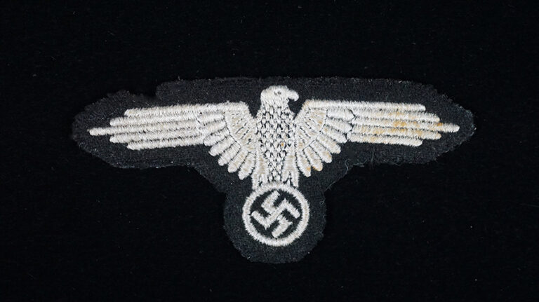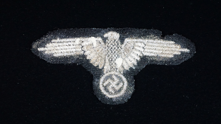 BUY / RESERVE THIS ITEMDescription: Waffen-SS Sleeve Eagle; second pattern (Circa 1938-1945); machine embroidered eagle in silvery/grey rayon threads on a black wool base. This is the final pattern machine embroidered version. Appears to may have been tunic removed; very nice!