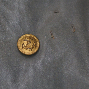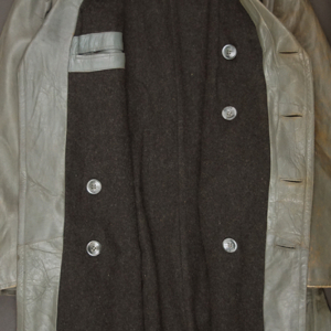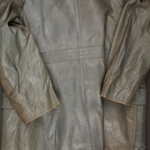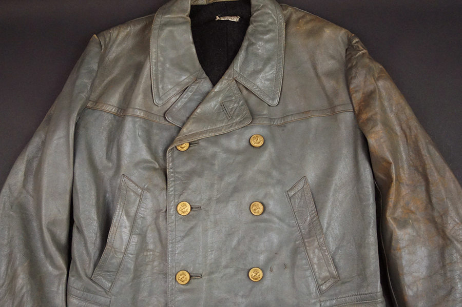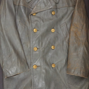 BUY / RESERVE THIS ITEMDescription:.WWII German Navy issue heavy gray leather Deck Jacket with full lining and internal knit cuffs. Gilt KM Buttons throughout and original Collar label with date of March 1943 and size 54. Kriegsmarine-Badge loops on the left chest for a badge with a horizontal pin & hook like many U-Boat badges 1914-45. Size: (German-54) US-44″ chest / 25″ sleeves shoulder to cuff / 42″ long from collar to skirt, Excellent overall.
