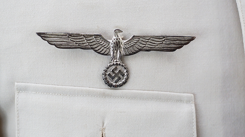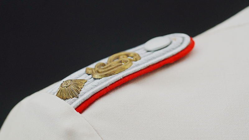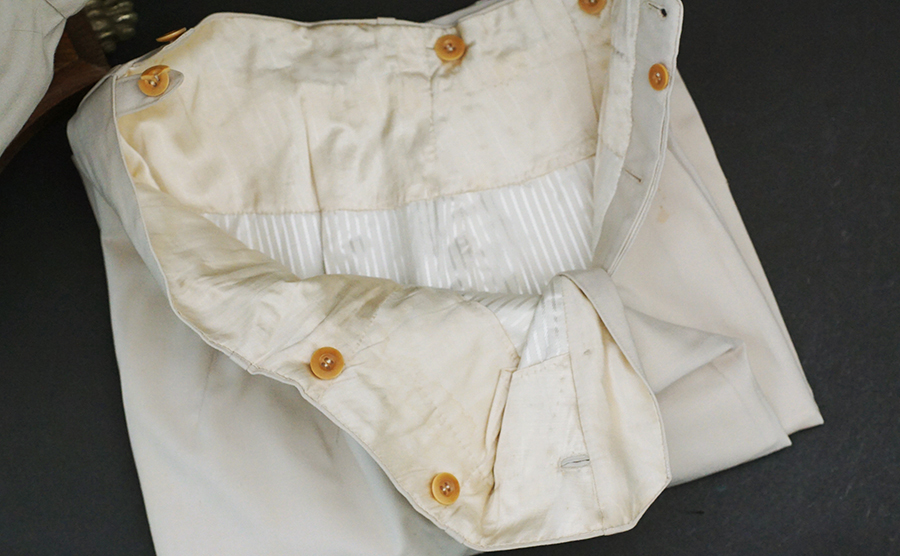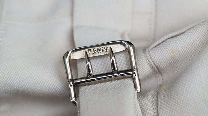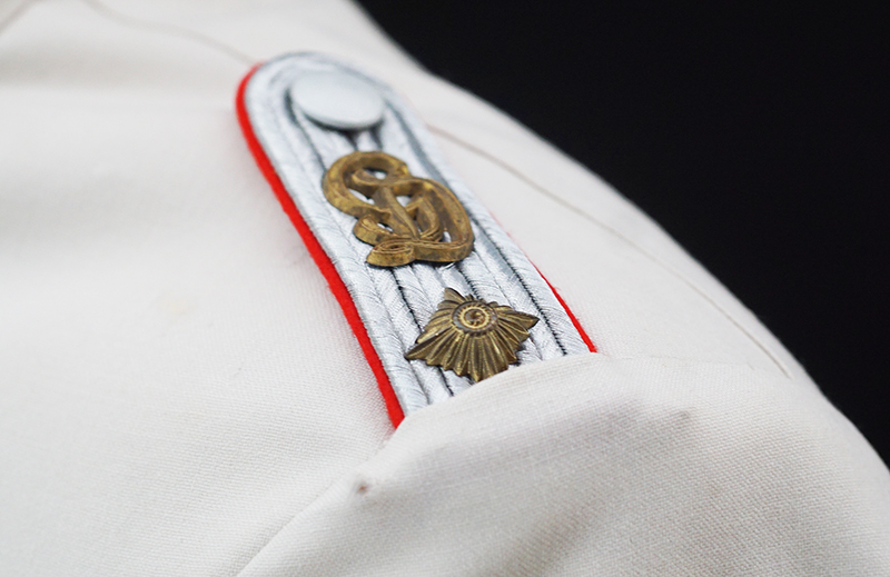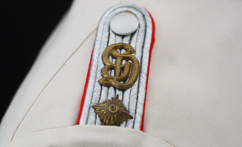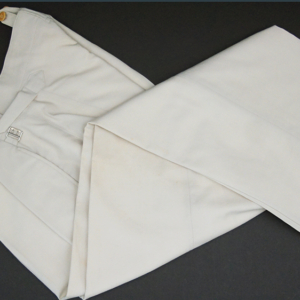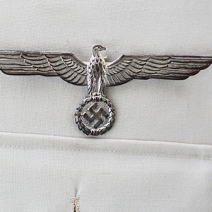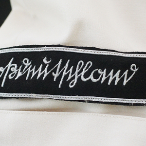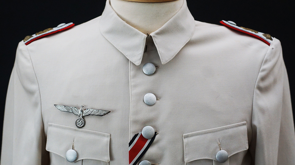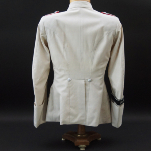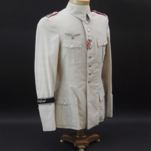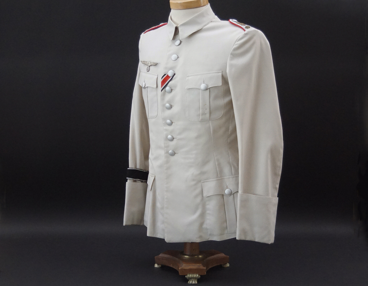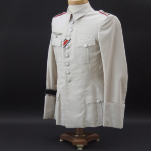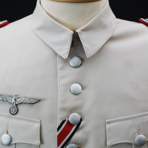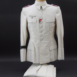 BUY / RESERVE THIS ITEMDescription: Heer Grossdeutschland Artillery Oberleutnant white summer dress tunic & trousers of the highest quality. This high-quality, Paris tailored early style tunic has an eight button front, made of summer weight fine white-wool and features matching slip-on shoulder boards for the rank of Oberleutnant. They have gold GD officer’s cyphers and red waffenfarbe indicating attachment to an artillery unit within the GD division. Sewn to the third button hole is the ribbon for the Iron Cross 2nd Class. On the left breast pocket are sewn three loops for the attachment of the officer’s decorations. Above the right pleated breast pocket is attached a nicely frosted metal officer’s breast eagle. On the lower French cuff right sleeve is a Grossdeutschland removable Snap-on cufftitle. The white silk lined interior is devoid of any labels. However, the matching white wool trousers display a single “PARIS” on each of the two side cinch belt buckles. This likely indicates this rare uniform was custom made in Paris during the occupation. Trousers are completely silk lined. A few very minor pin-hole bites at rear waist & one wear spot at left shoulder board. The uniform is very slightly worn, and is in overall excellent plus condition.