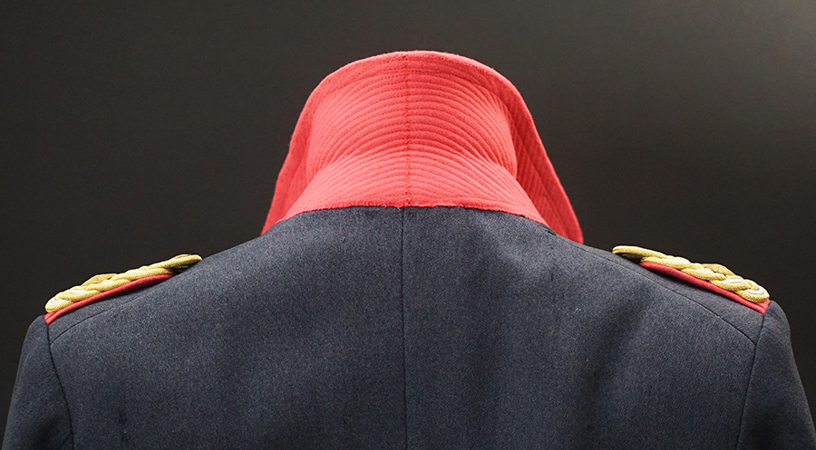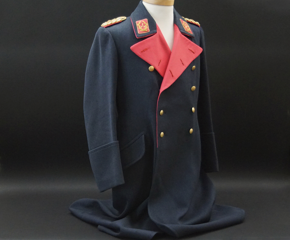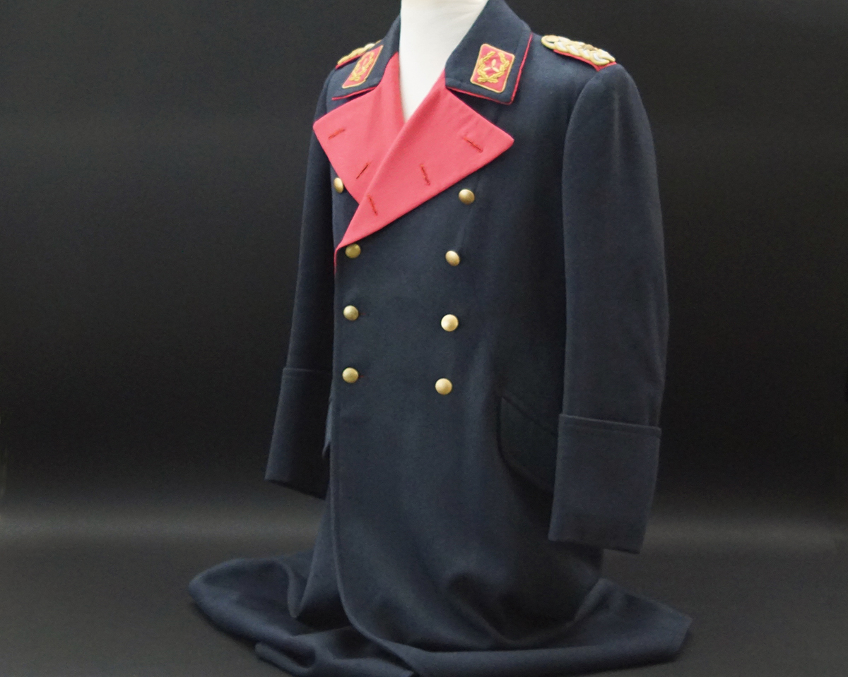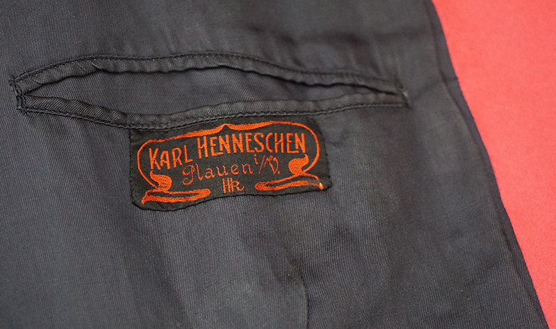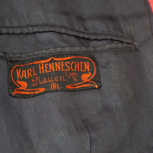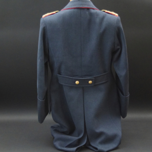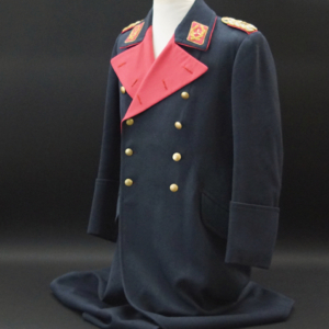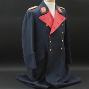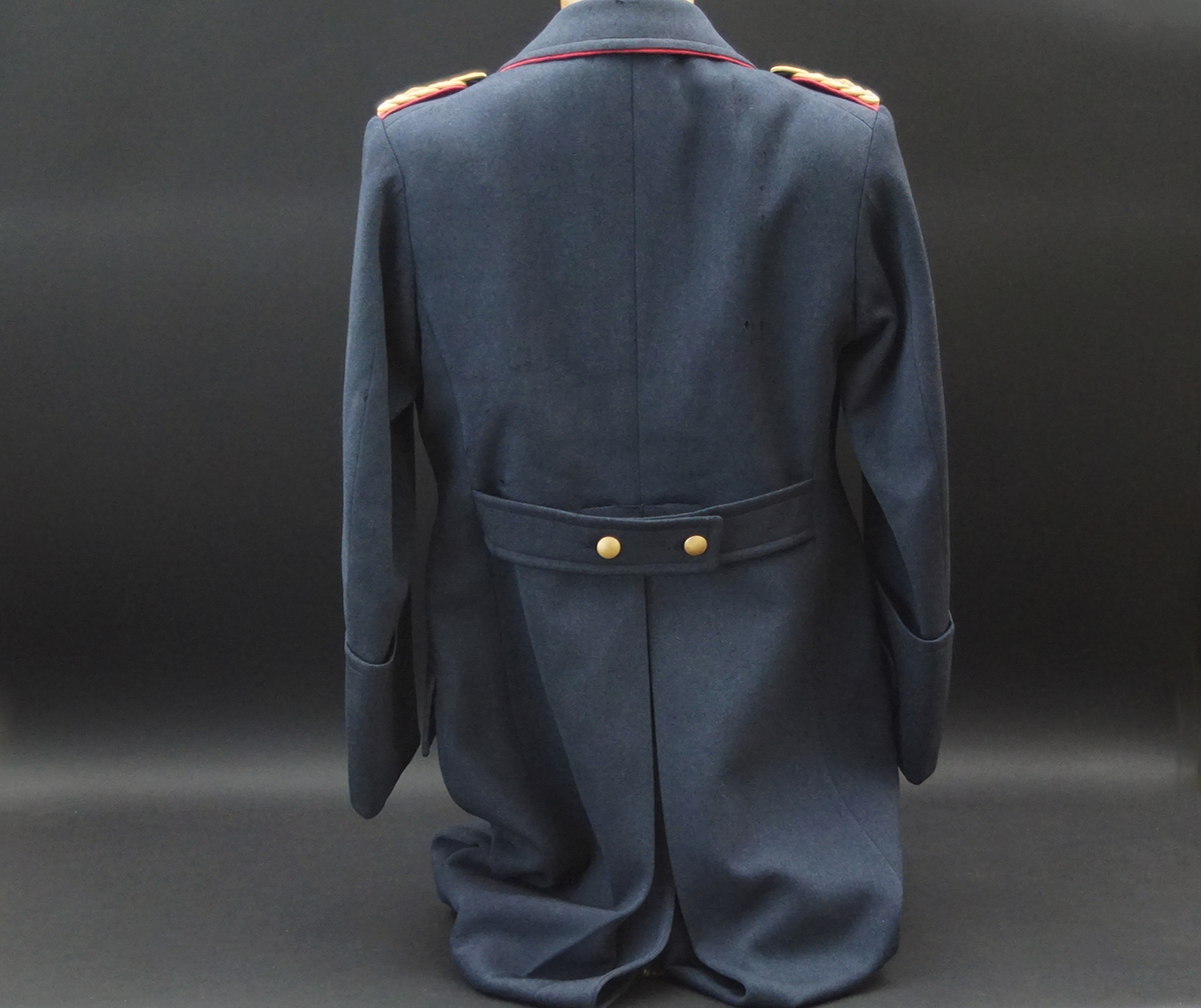 Description:  Luftwaffe Corps of Engineers (Leitender Fl. Chefingenieur) general officer’s greatcoat; This is the highest rank of the Luftwaffe Corps of Engineers. This magnificent example features machine sewn matching cellon shoulder boards with a single rank pip affixed to the intertwined gold and silver cords. The matching pink collar tabs are also cellon with the highly detailed gold bullion wreath with a vertical propeller. The lapels present pink facing matching the collar tabs and shoulder boards. The highest quality tricot wool coat was used in the construction of this tailor-made garment. The double-breasted front displays ten gold Overhoff & Cie marked closure buttons. The interior is lined with blue-gray artificial silk. The tailor’s label is sewn onto the interior breast pocket indicating “KARL HENNESCHEN, Plauen”. A dagger hanger strap is sewn to the interior for attachment of the general’s dagger or sword.