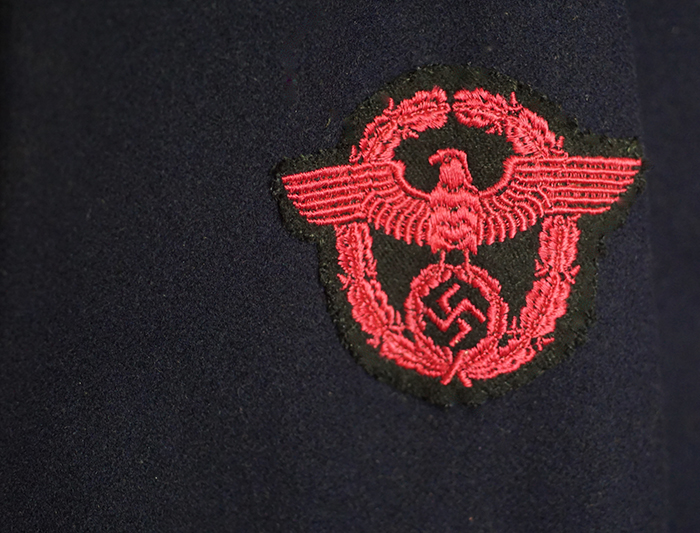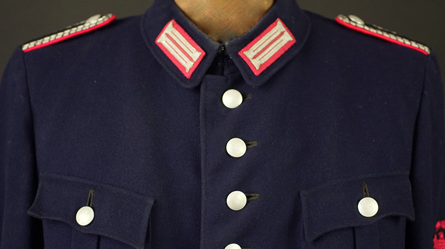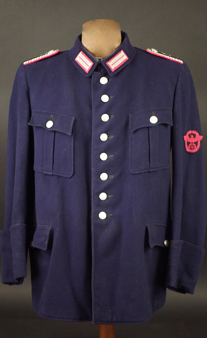 BUY / RESERVE THIS ITEMDescription: Nice quality, deep navy blue doeskin wool service tunic; features a vertical, eight button front closure with dual metal hooks and eyes positioned at the forward neckline and a lay down collar. The left front closure panel edge is trimmed in carmine wool piping. The tunic has two, pleated patch breast pockets and two non-pleated patch hip pockets, all with scalloped button down flaps. The straight cut, non-adjustable sleeves have simulated French cuffs with carmine wool piping to the top edges. Pair of nickel belt ramps at rear waist. Original Collar tabs, sleeve eagle and sew-in shoulder boards. All ‘extra fine brand marked buttons. Good large size for the period. A nice untouched Third Reich Civil Tunic.