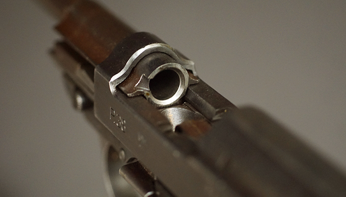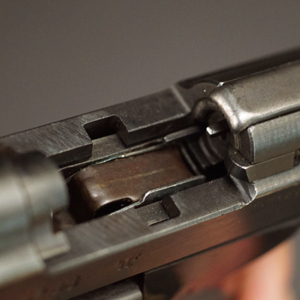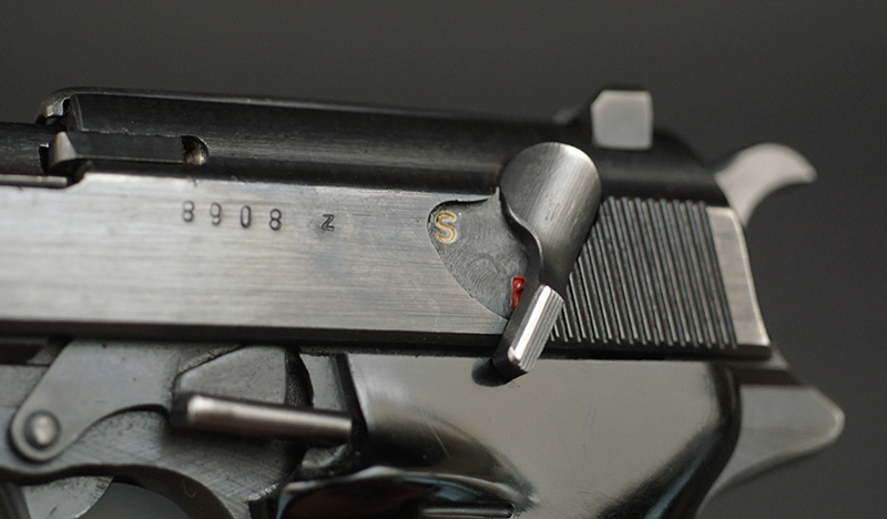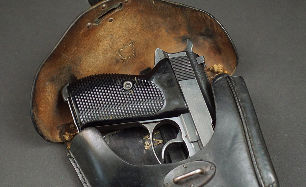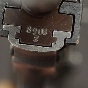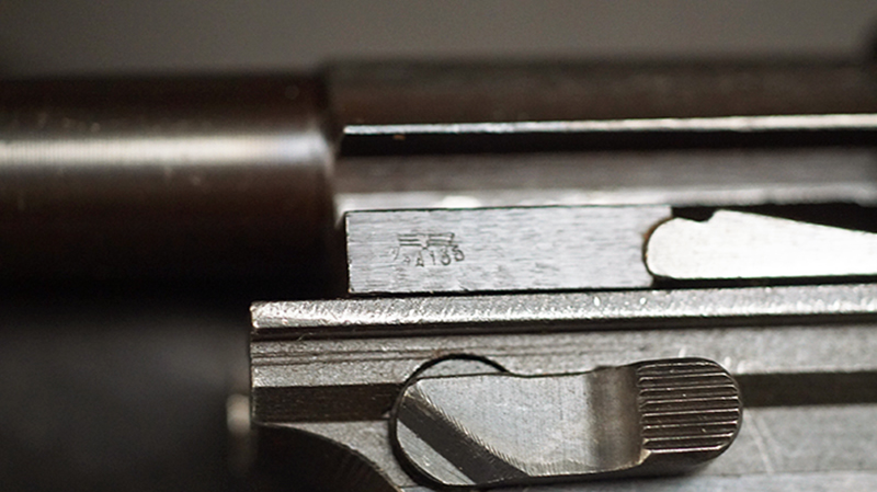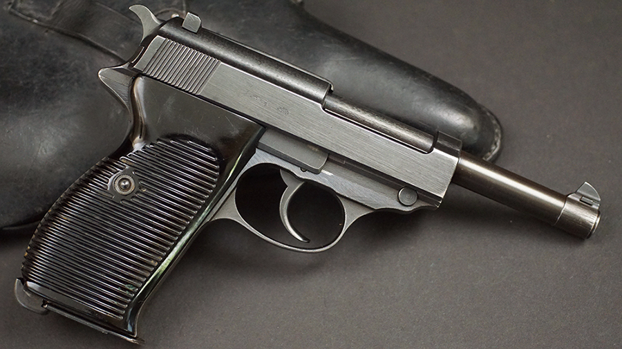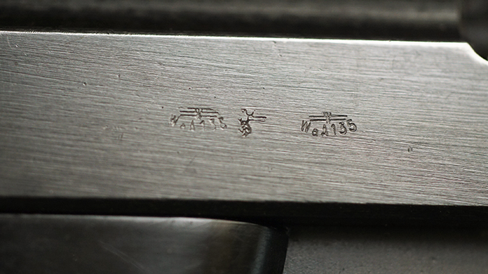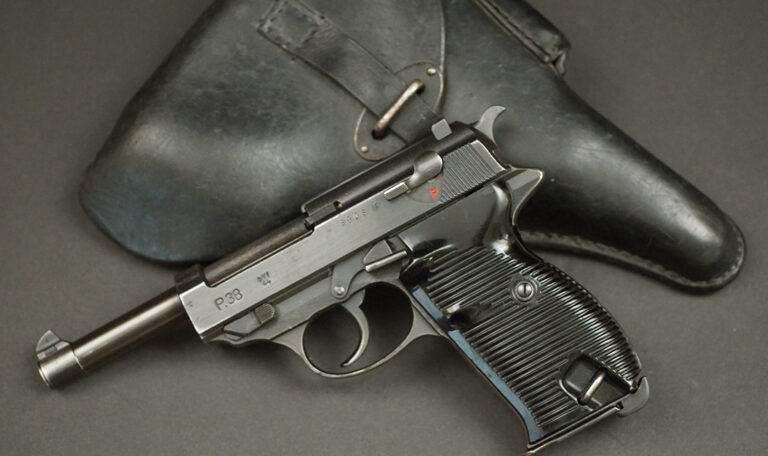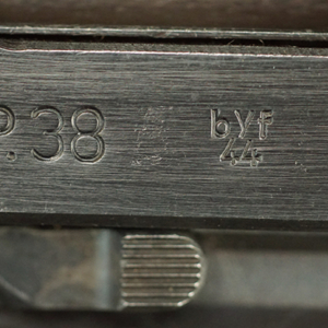 Description: Wehrmacht issue 1943 Mauser P.38 Double action Automatic Pistol; byf code variant, Mid-war 1943 production; matching numbers; 8 shot magazine, 9mm; 95% original military blue finish overall w/ slightest edge wear; s/n 8908z; most parts correctly stamped Eagle-135 ; bore bright, action tight and crisp; original unmolested grips & grip screws; period original JVD proofed magazine that should be w/WaA135. An excellent example that comes in a fair condition ‘hard shell’ holster.