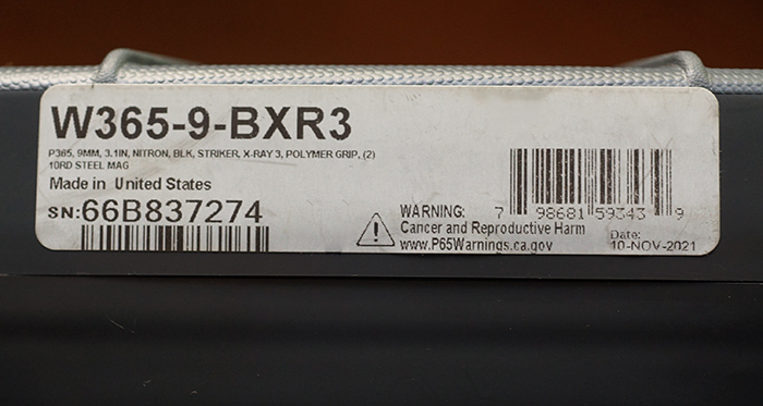 BUY / RESERVE THIS ITEMDescription: SigSauer Model 365 (W365-9-BXR3) semi-auto pistol; striker-fired/Polymer grip, black finish, .9mm, 3.1 inch barrel; (2)10RD steel magazines; bright bore; approx. 1lb 3oz empty; trigger pull is 28N; serial number 66B837274; As-new In original factory labeled box w/ all documentation. The perfect back-up carry.